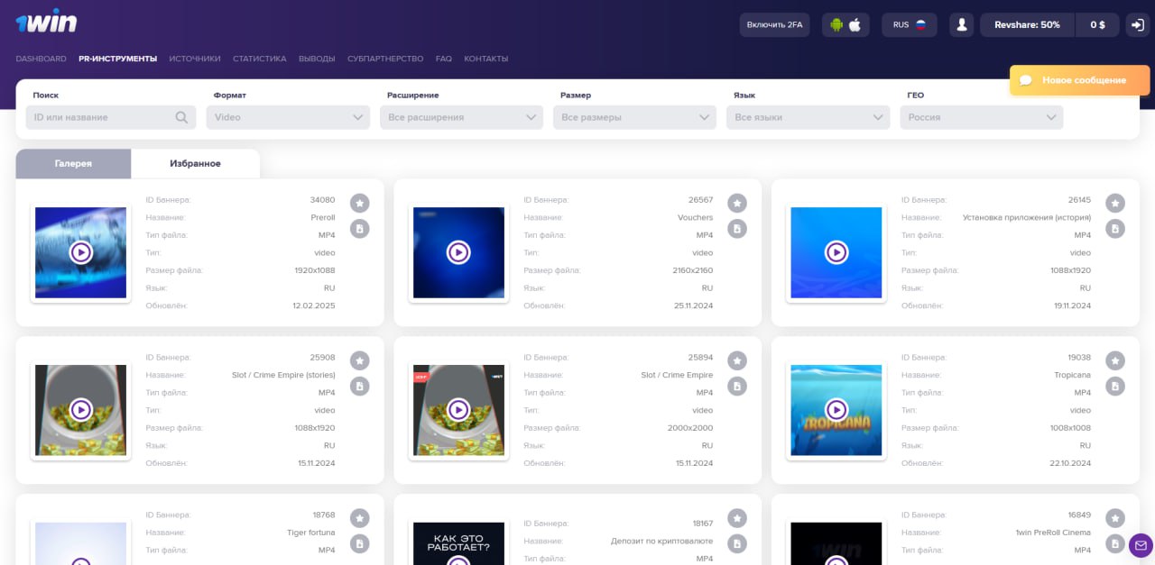 В разделе промоматериалов можно подобрать баннер от прямого рекламодателя: партнерская программа 1win предлагает десятки креативов на выбор. Вы можете выбрать креатив на основании следующих параметров: