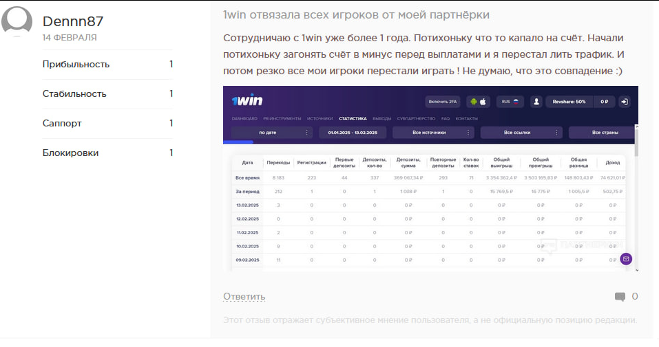 Другие отзывы на партнерку 1win говорят о высоком проценте ревшары и быстром обновлении статистики: