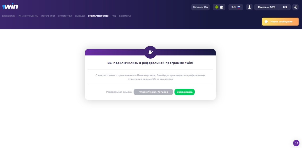 В следующем разделе можно взять ссылку для работы по реферальной программе 1вин: партнерка выдает ее сразу без запроса. Отчисления бессрочные и составляют 5% от дохода реферала.