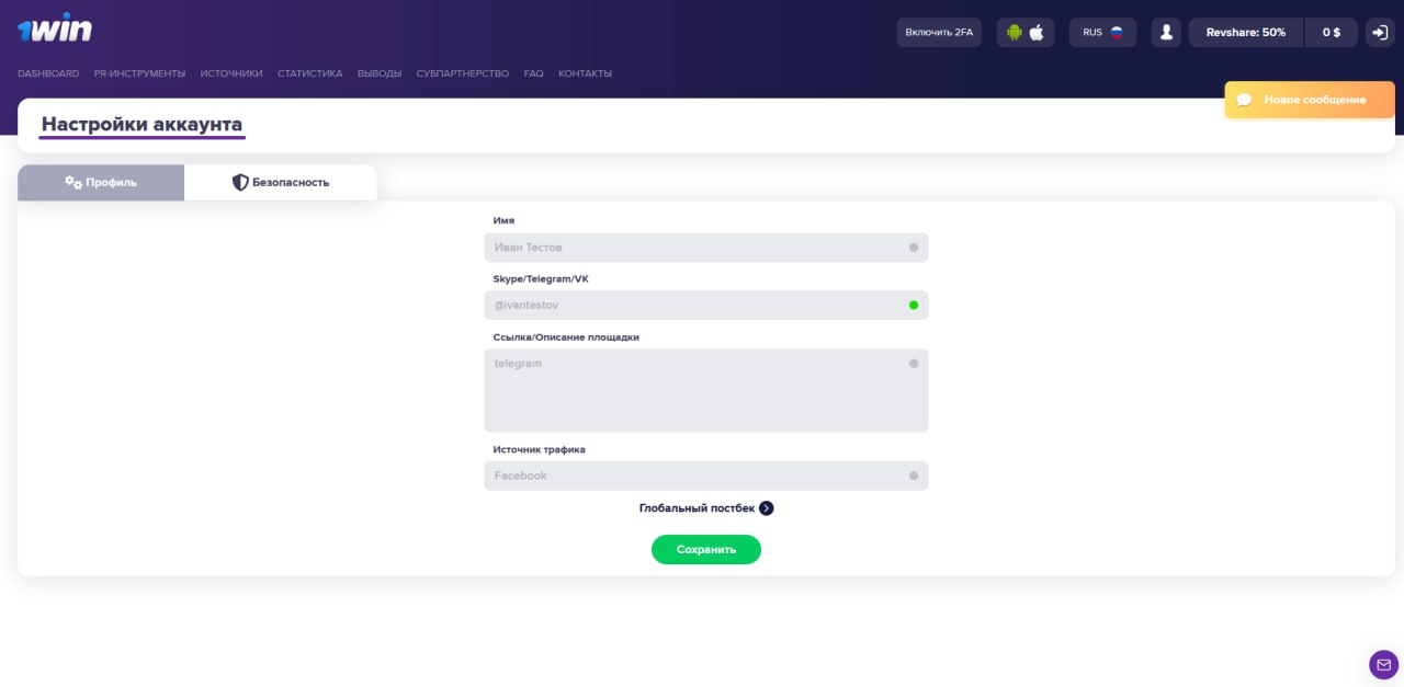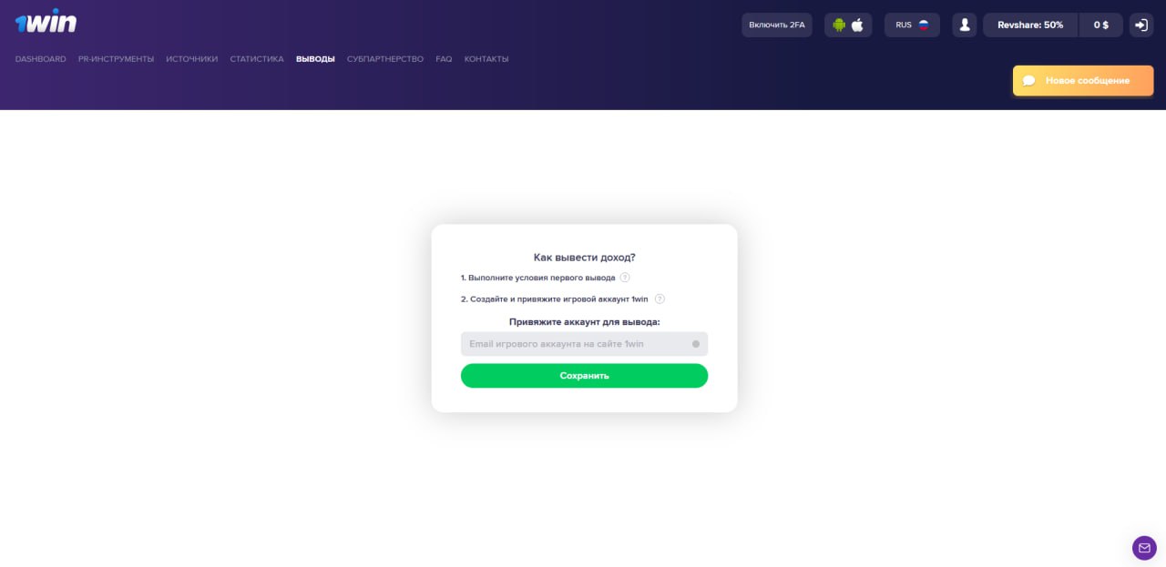 Для вывода денег вам потребуется завести игровой аккаунт на сайте 1вин: партнерка перечисляет выплату на указанную в профиле платежную систему.