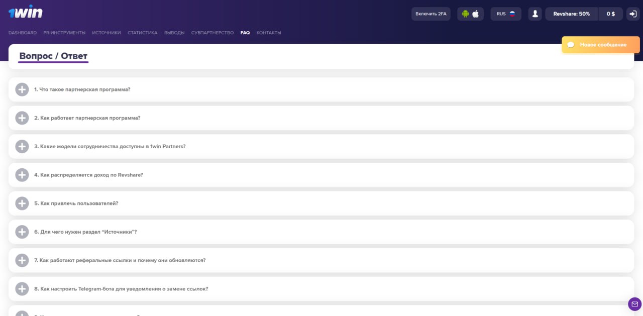 В случае, если вам непонятно что-либо по работе с 1win, партнерка предлагает раздел FAQ с детальными ответами на самые частые вопросы: