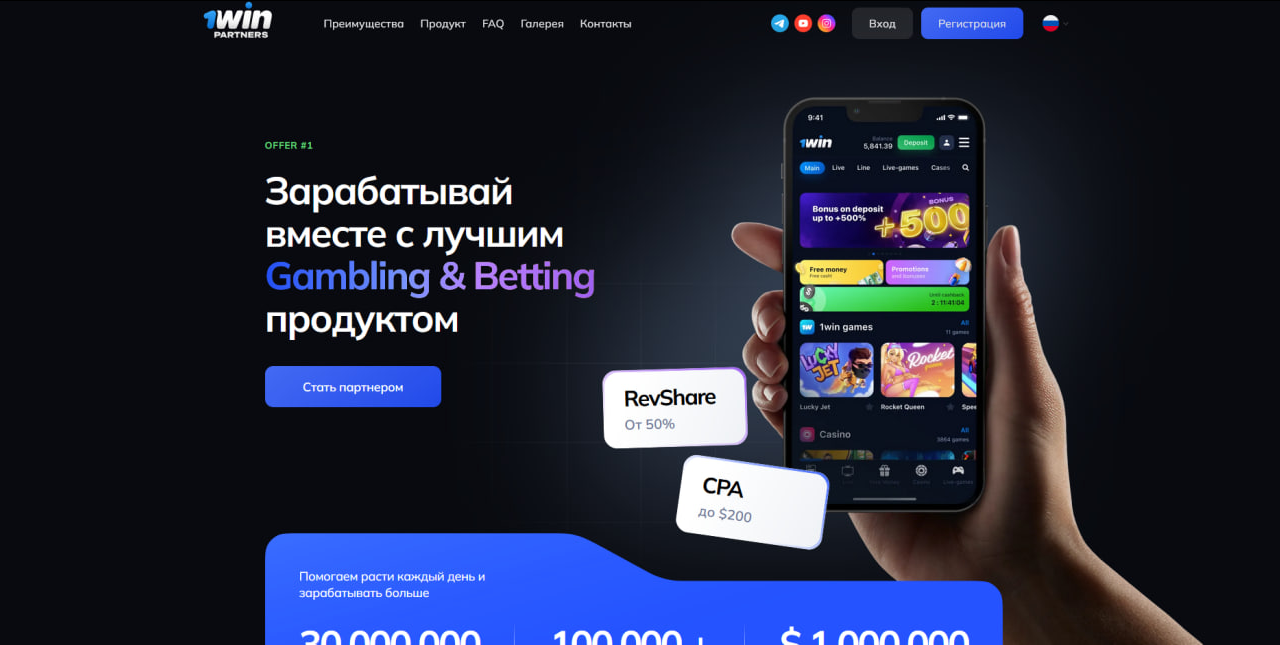 1win Partners — это прямой рекламодатель крупного гемблинг-проекта 1win, который проявляет высокую активность в affiliate-комьюнити, организует войсы с другими арбитражными селебрити и энергично продвигается в медиа. Партнерская программа 1win предлагает только один продукт для продвижения, а также беспечивает максимальную поддержку вебмастеров и высокие ставки.