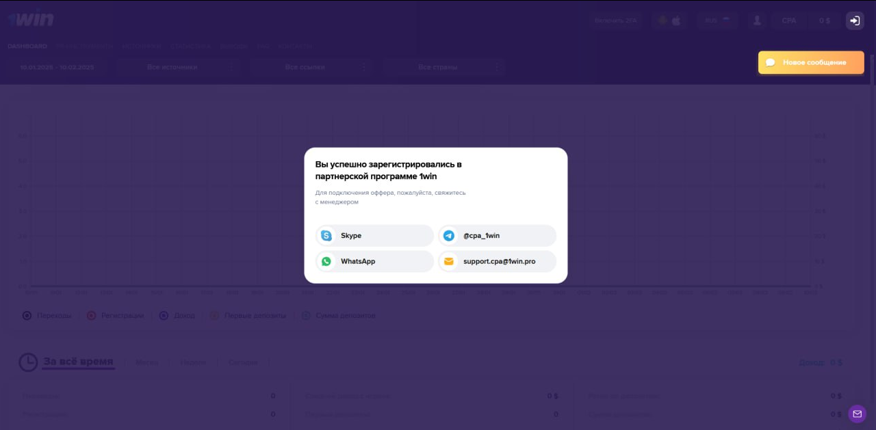 После ввода данных вы сразу получите уведомление об успешной регистрации: остается только написать менеджеру по одному из указанных контактов и активировать доступ к 1win affiliate program.