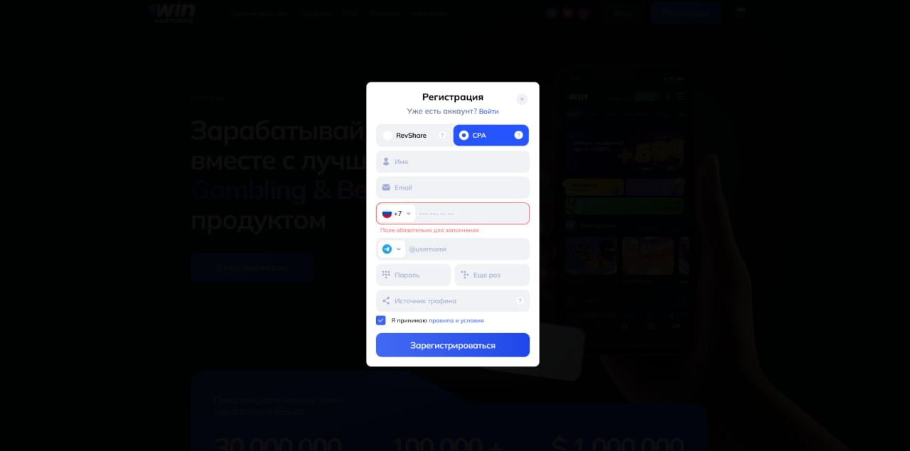 На старте работы с 1win партнерка просит указать имя, email, номер телефона, контакт в Telegram и источник трафика, а также выбрать желаемую модель оплаты: