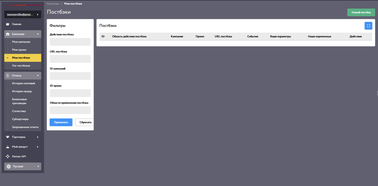 Партнерская программа Alpha Affiliates также предоставляет весь необходимый инструментарий для работы с постбеками:
