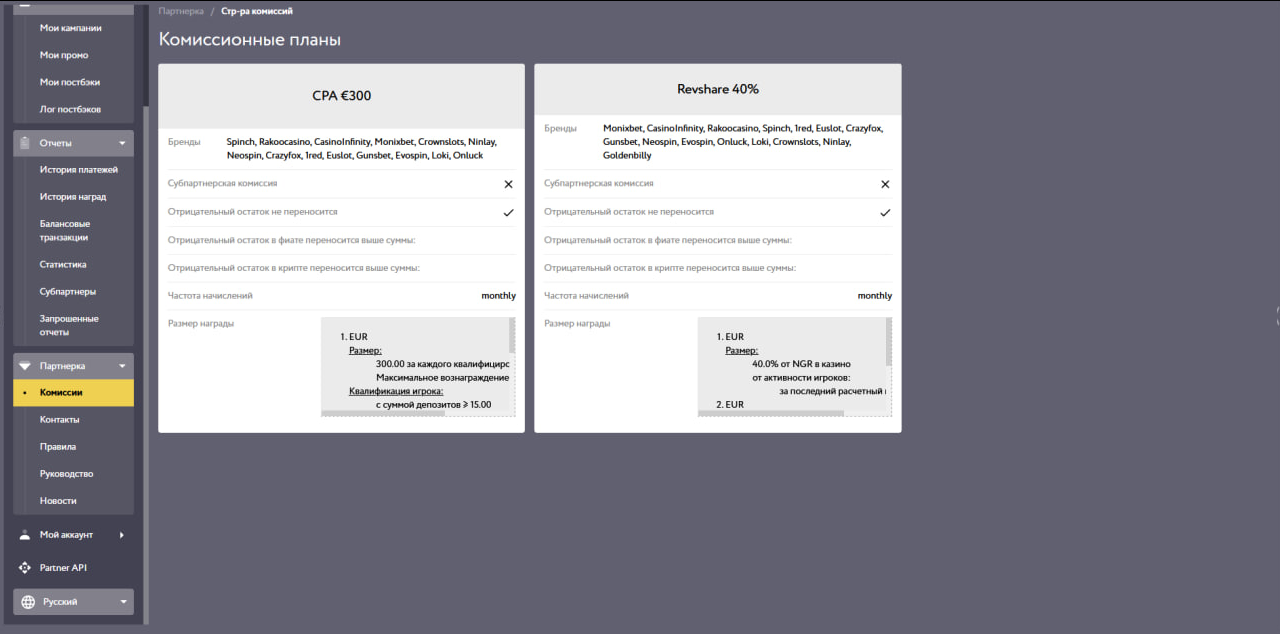 Ставки: CPA до €500, RevShare до 50%, Hybrid обсуждается индивидуально