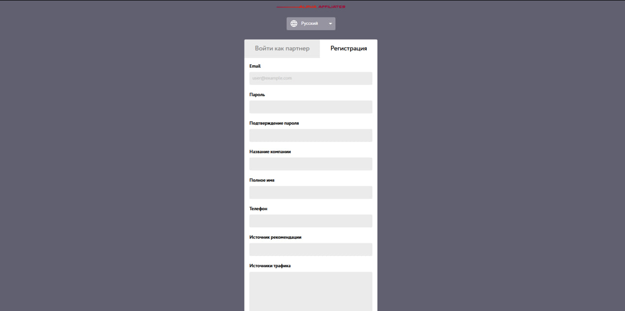 Каждого новичка на платформе ждет заполнение формы с личными данными, включая: электронную почту, пароль, имя компании, телефон, источник рекомендации и источник трафика: