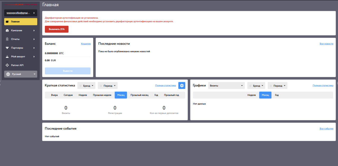 На главной странице расположен дашборд с балансом и новостями компании. Также здесь можно просмотреть краткую статистику или выбрать график уников и других показателей.