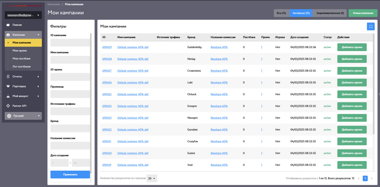 В разделе кампаний сразу есть 15 активных офферов. Вы также можете выбрать оффер по конкретным фильтрам:
