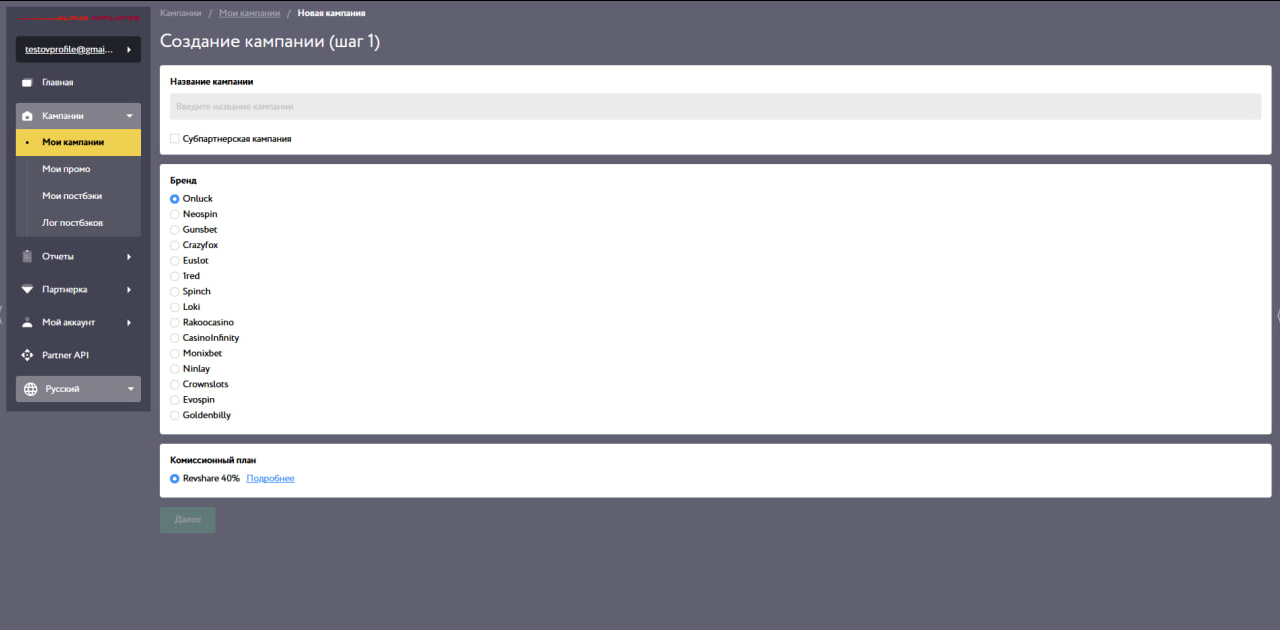 Чтобы получить рекламную ссылку, нужно пройти через несколько стадий, на первой из которых вы выбираете бренд и комиссионный план, который по умолчанию всегда составляет 40% по RevShare: