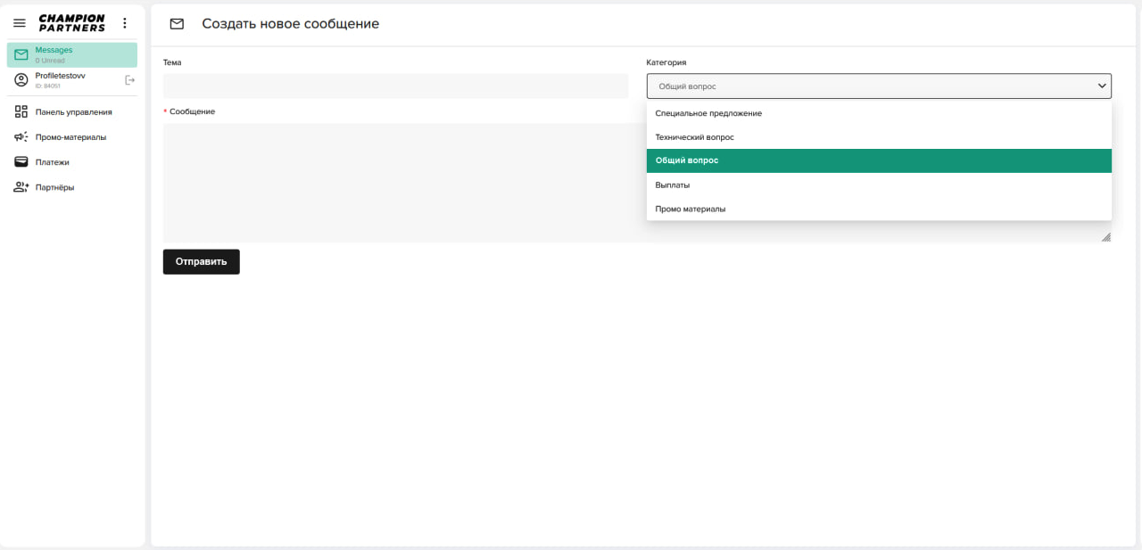 Саппорт партнерки доступен прямо на сайте — с ним можно общаться через форму сообщений. Кроме того, после регистрации личный менеджер напишет вам в Telegram.
