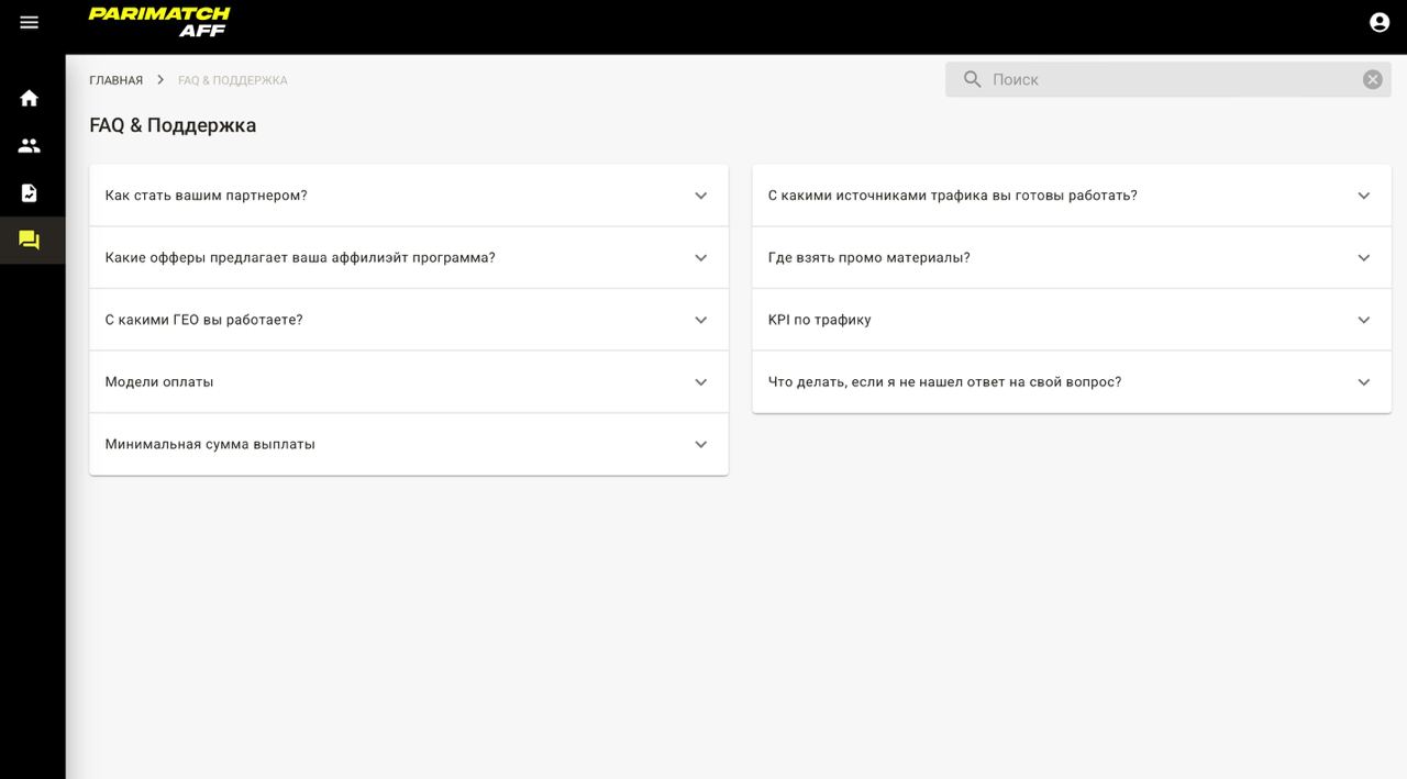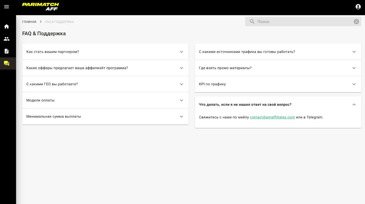 Для тех, кто не знает, как сотрудничать с Париматч, партнерка подготовила FAQ с ответами на наиболее частые вопросы в разделе «FAQ & Поддержка»: какие доступны гео, какие источники можно использовать, а также про KPI по трафику.