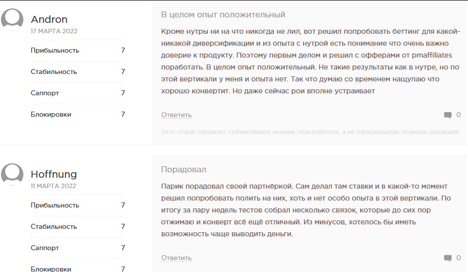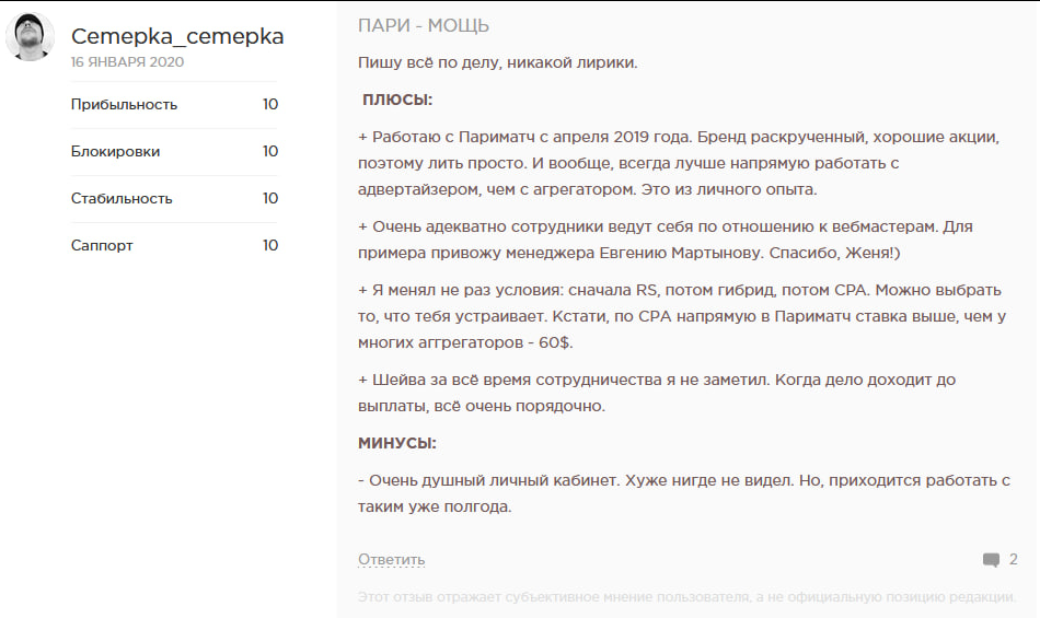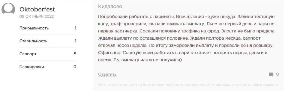 Есть и негативные мнения про Париматч: отзывы на партнерку такого рода не очень частые, но тоже присутствуют. Например, это спорные ситуации, когда трафик вебмастера посчитали фродом.