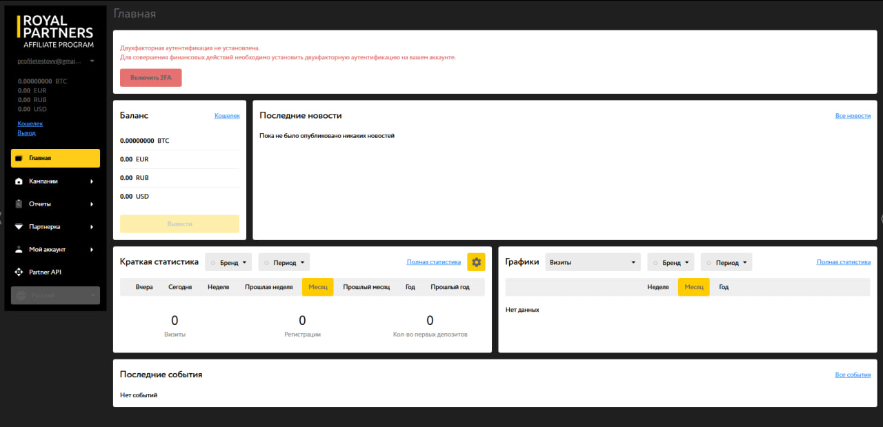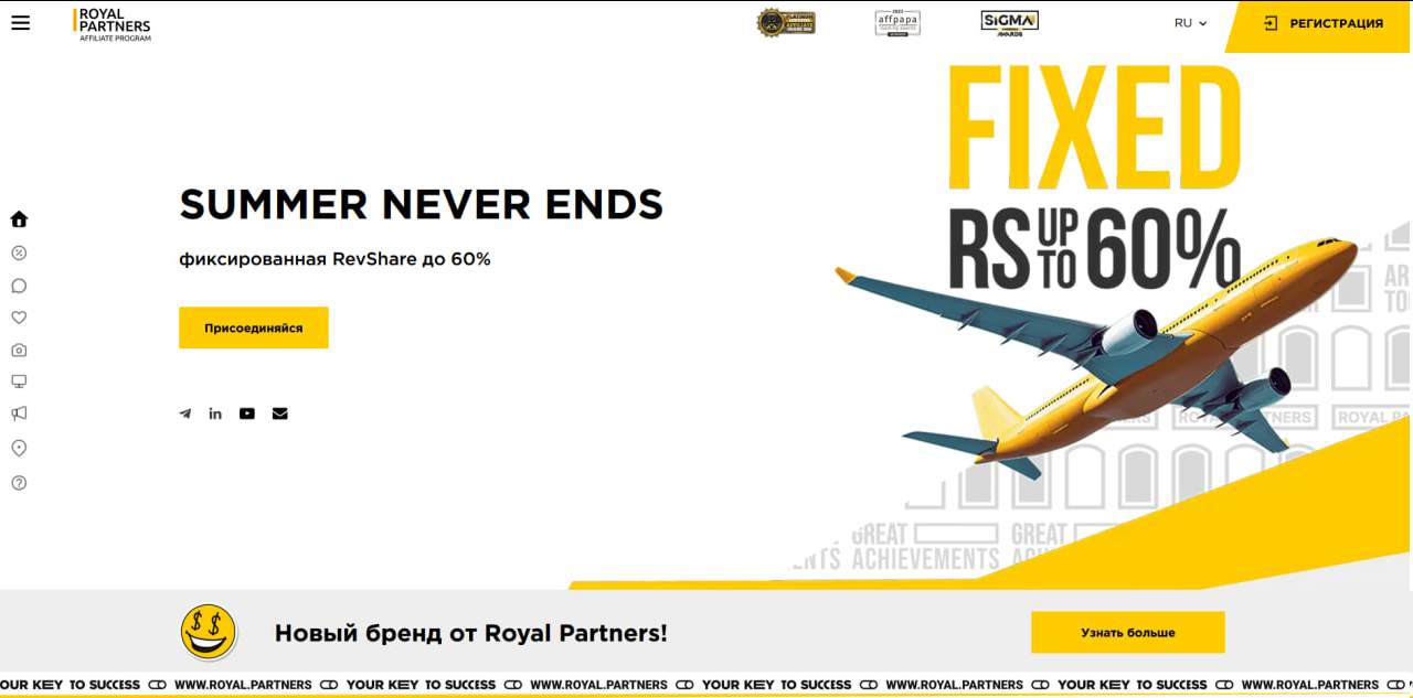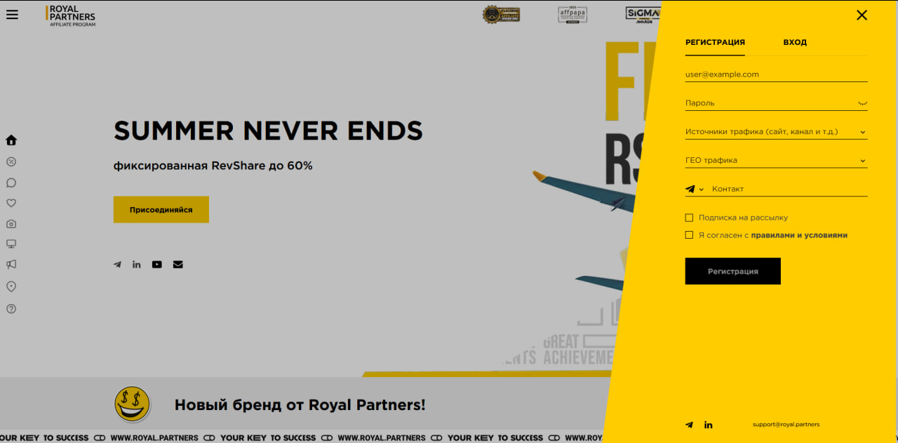 Royal Partners — официальный представитель 16 in-house продуктов. Партнерская программа была создана в 2017 году и активно использует affiliate-медиа для продвижения своих офферов.