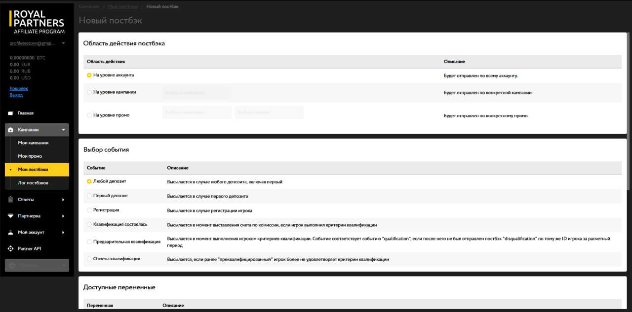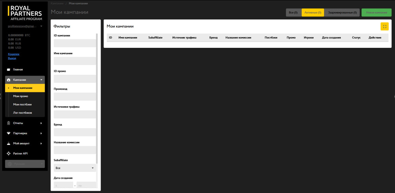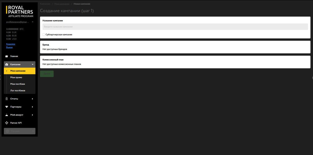 Для запуска новой РК нужно согласовать оффер и модель оплаты с личным менеджером. Далее потребуется придумать название РК, выбрать бренд и комиссионный план.