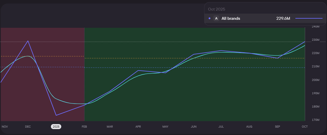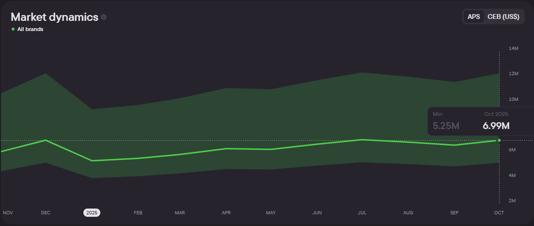 Brand’s Accumulated Power (BAP) — показатель, который отражает долю бренда в общем интересе местных пользователей. График охватывает последние 12 месяцев.