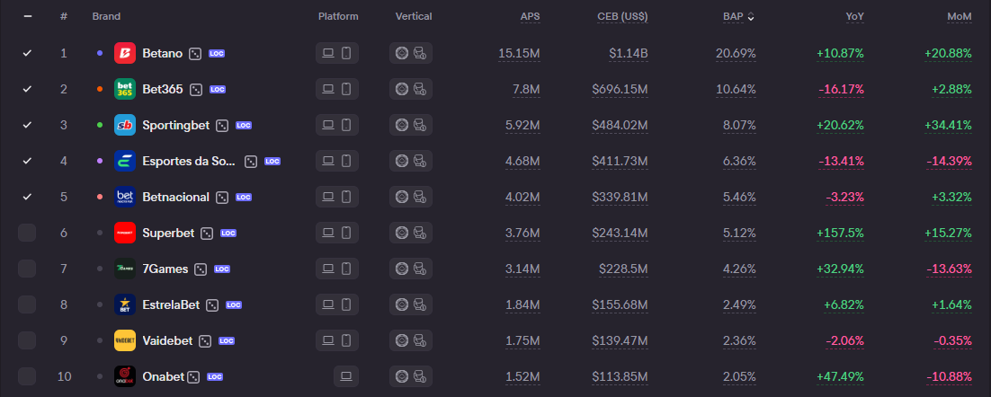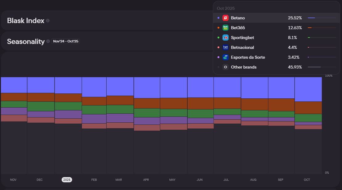 Однозначный лидер рынка — бренд Betano с показателем BAP в 25,52% и колоссальными показателями APS и CEB. Больше года он остается самым популярным брендов в стране. За год его показатель Blask Index увеличился более чем на 10%.