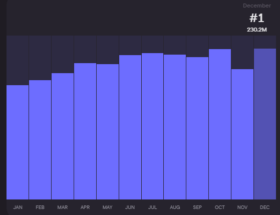 Сезональность учитывает объем активности пользователей в разрезе каждого месяца. В основе графика лежит Blask Index. Месяц с самой высокой активностью в Бразилии — декабрь с показателем в 230,2 млн.