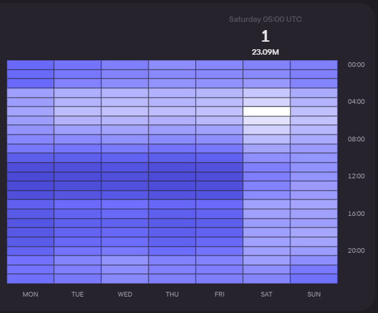 Чем светлее ячейка на тепловой карте Blask, тем выше активность населения. Так, в субботу в 05:00 UTC активность максимальная и равняется значению 1