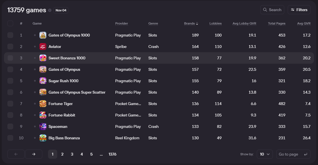 Несмотря на медийную доминацию краш-игр и казуальных игр, на момент 4 ноября самым популярным слотом в Бразилии остается слот Gates of Olympus 1000 от Pragmatic Play. Он есть у 189 брендов из 552 представленных на рынке. Можно сделать вывод, что часть операторов теряют пользователей и доход из-за отсутствия этого слота в своем ассортименте.