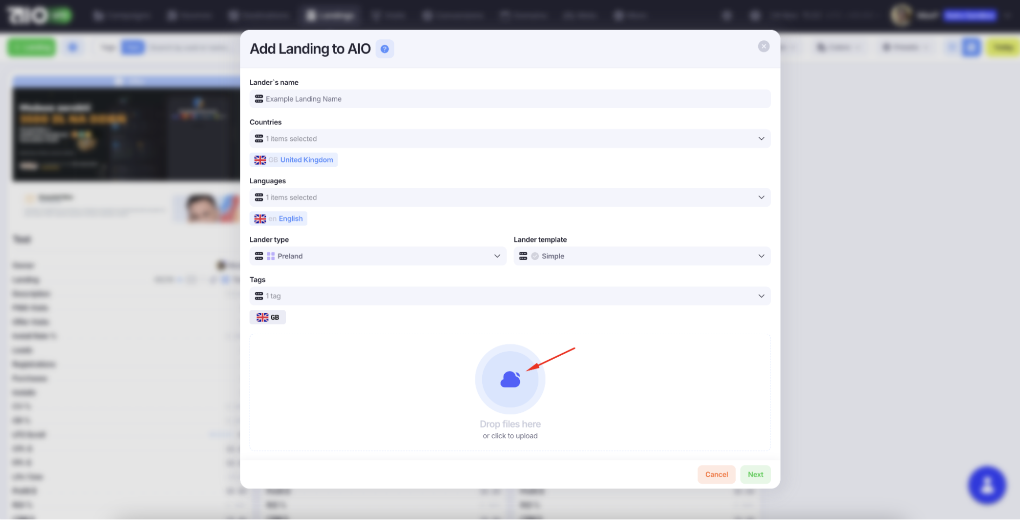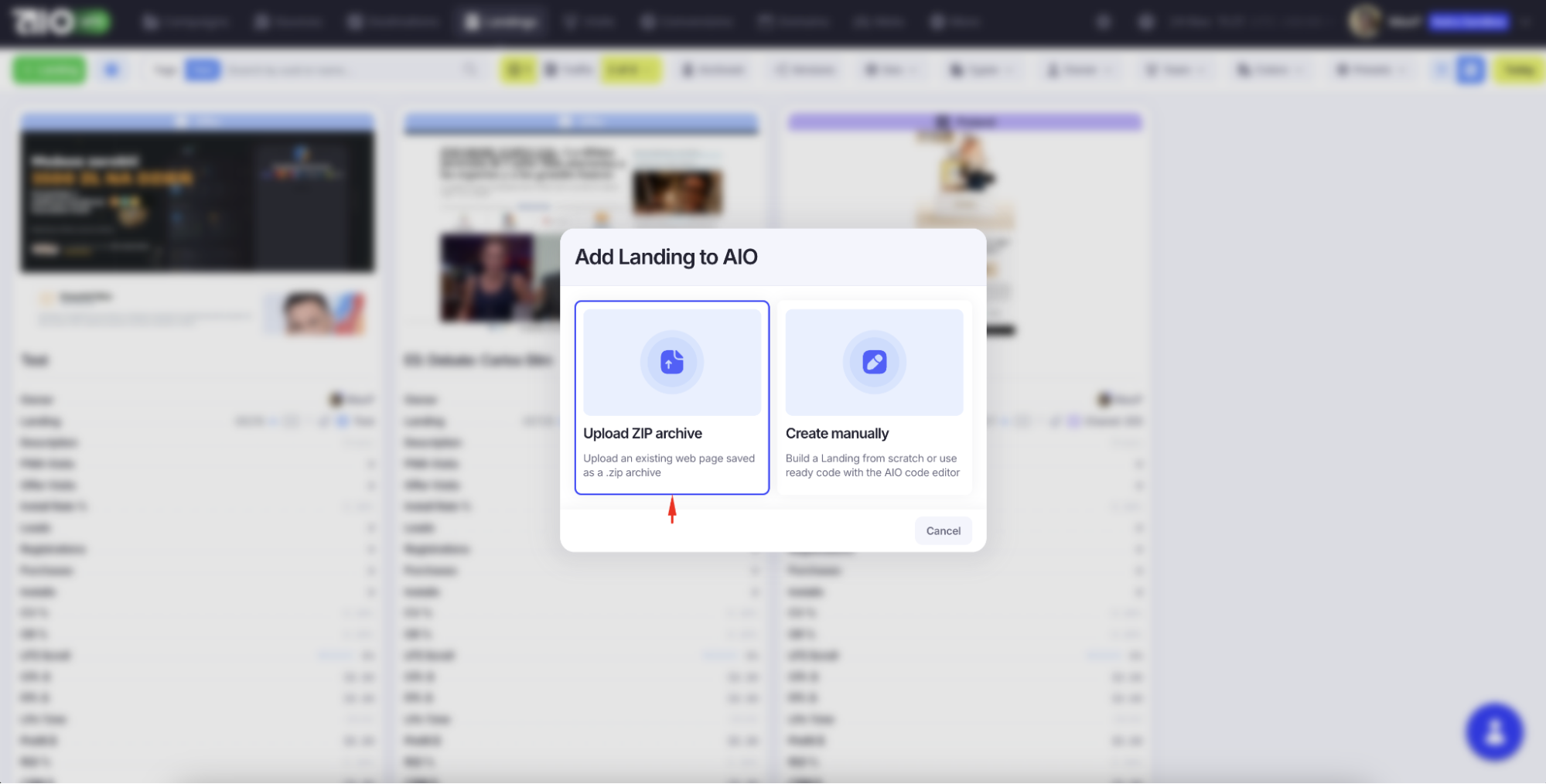 1. Нажмите «+ Landing» в левом верхнем углу, затем «Upload ZIP Archive» и выберите файл.