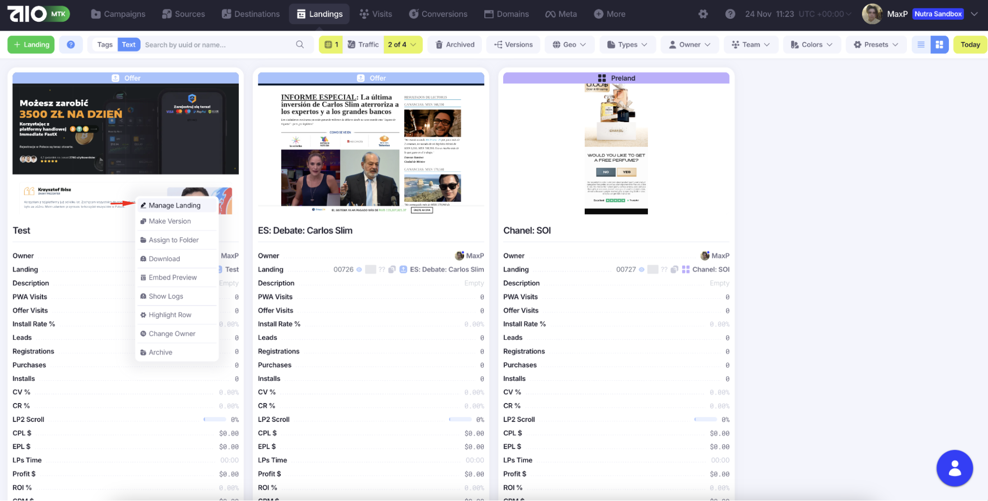 Переходим к работе с лендингами в разделе «Landings». Чтобы добавить их: