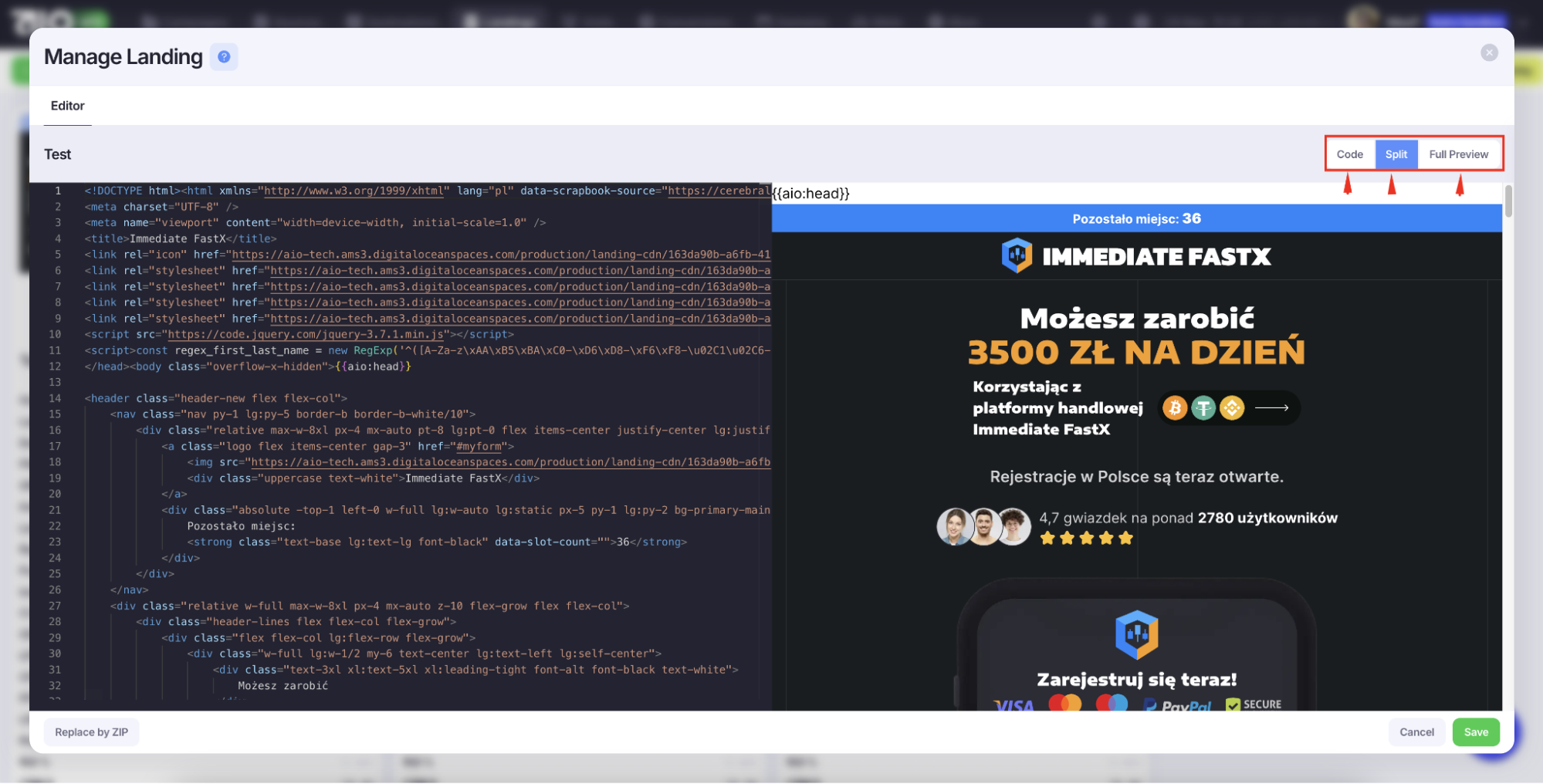 Чтобы отредактировать лендинг, щелкните по нему правой кнопкой мыши и выберете «Manage Landing». Доступны три режима: Code, Split view для изменения в коде и Full Preview для визуального просмотра страницы.