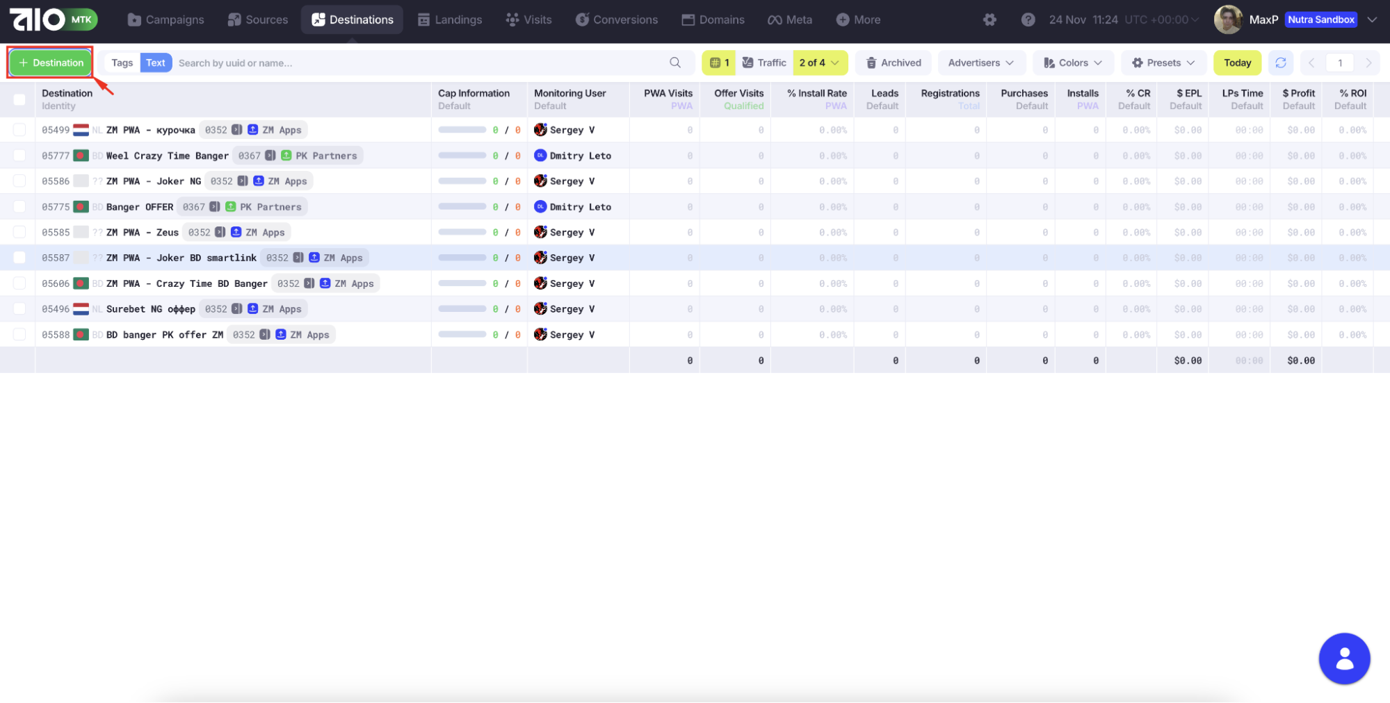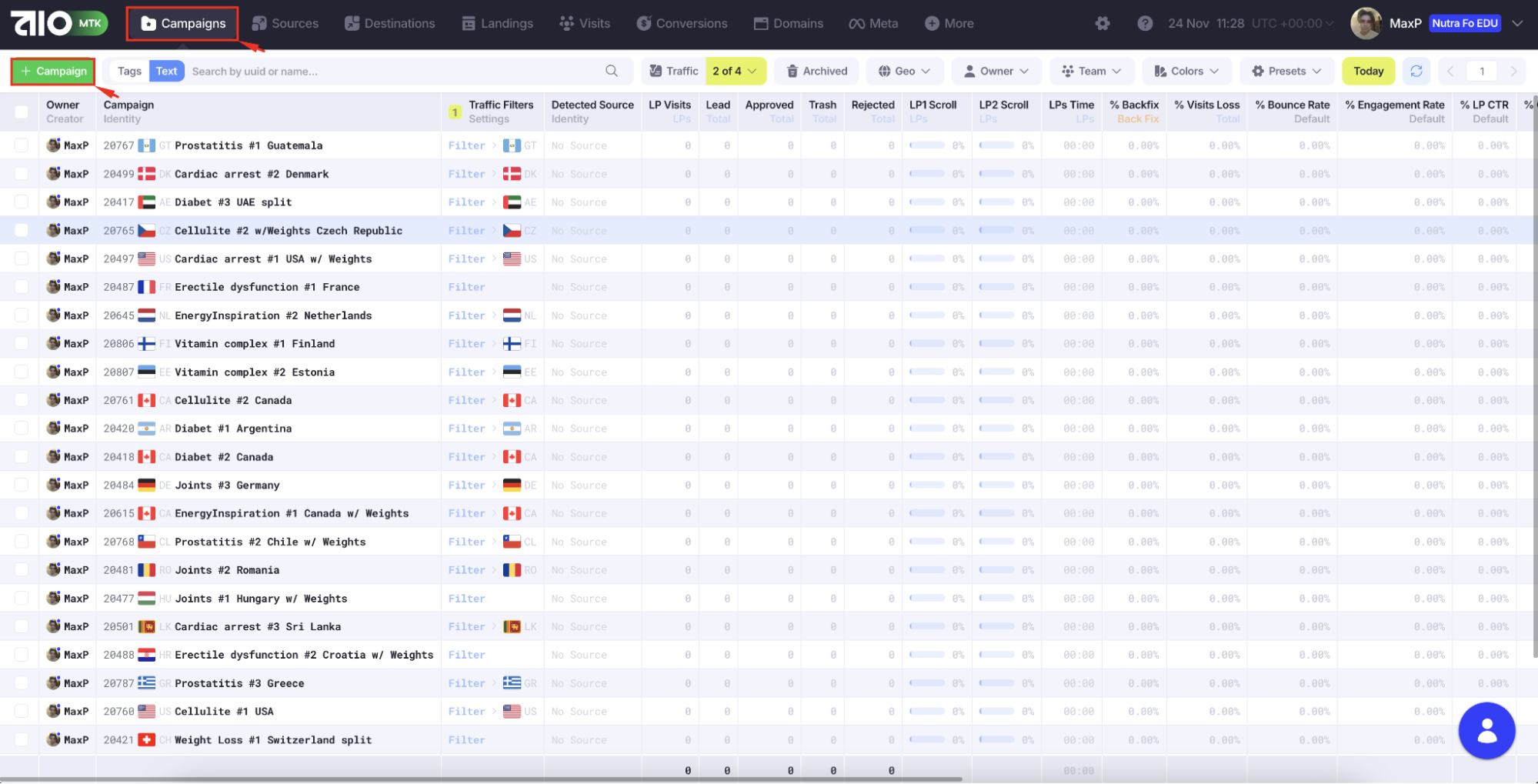 После входа в систему вы увидите вкладку «Campaigns». Здесь будут собраны все ваши кампании. Кампания — это некий шаблон, который уже содержит в себе воронку, соединяющую источник (source) с оффером (destination).