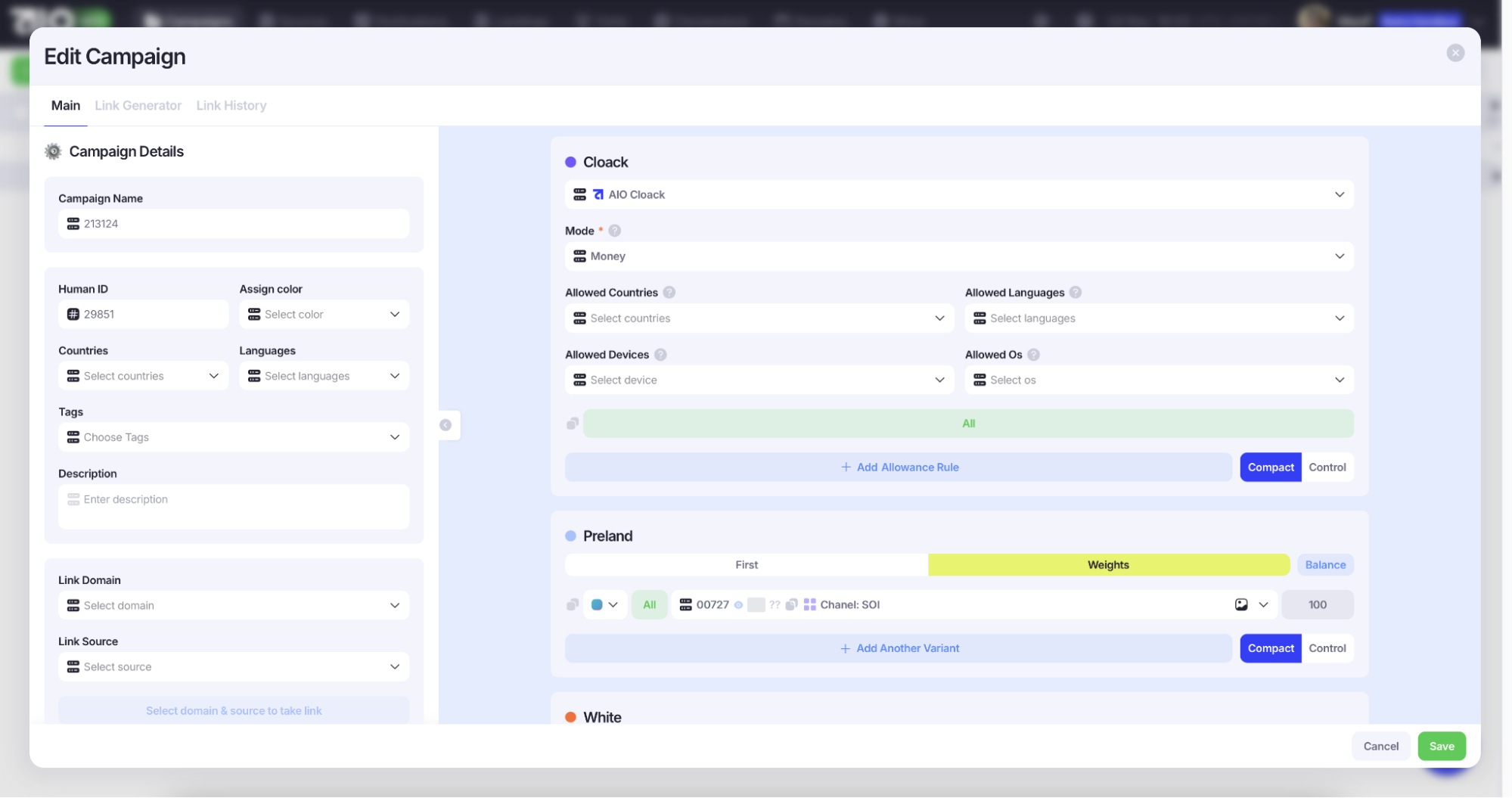 1. Сначала настройте клоаку, которая имеет три режима: filter (пропускает только нужный трафик), money (весь трафик идет на целевую страницу), white (весь трафик отправляется на white page).