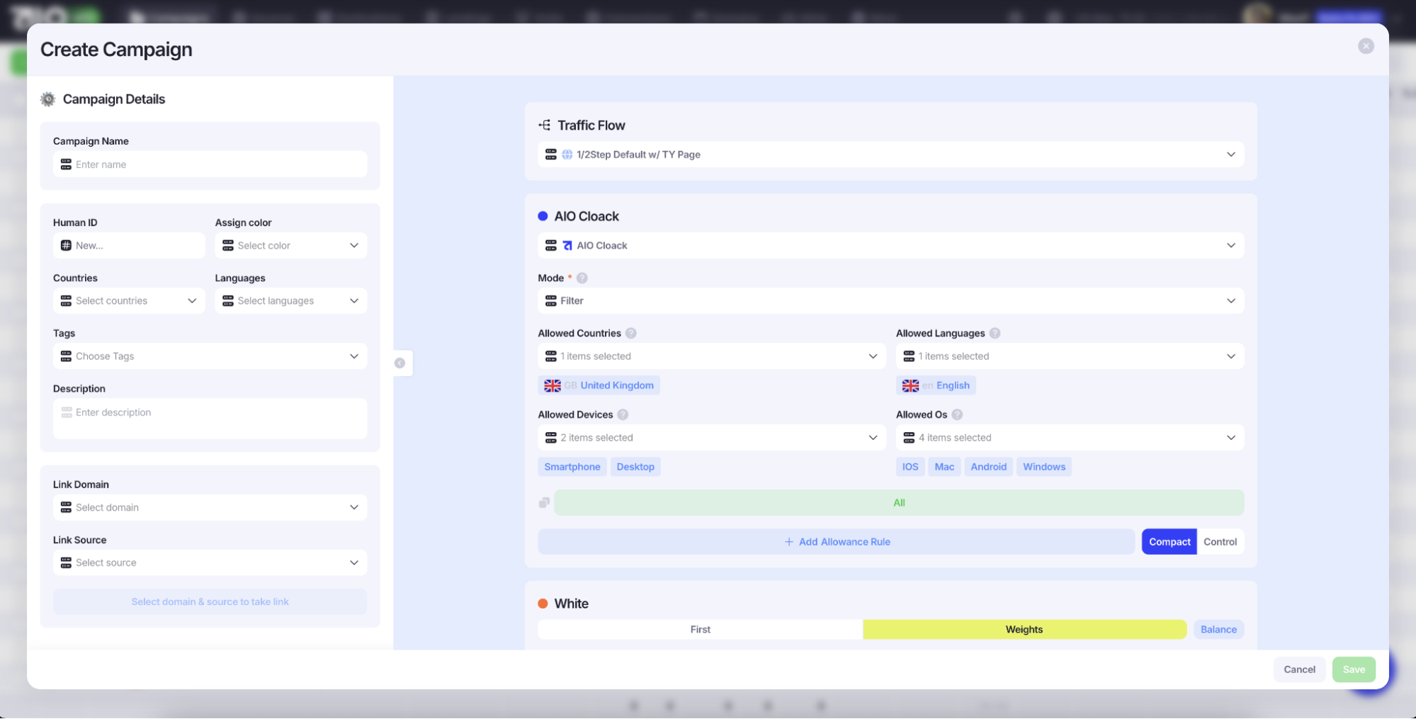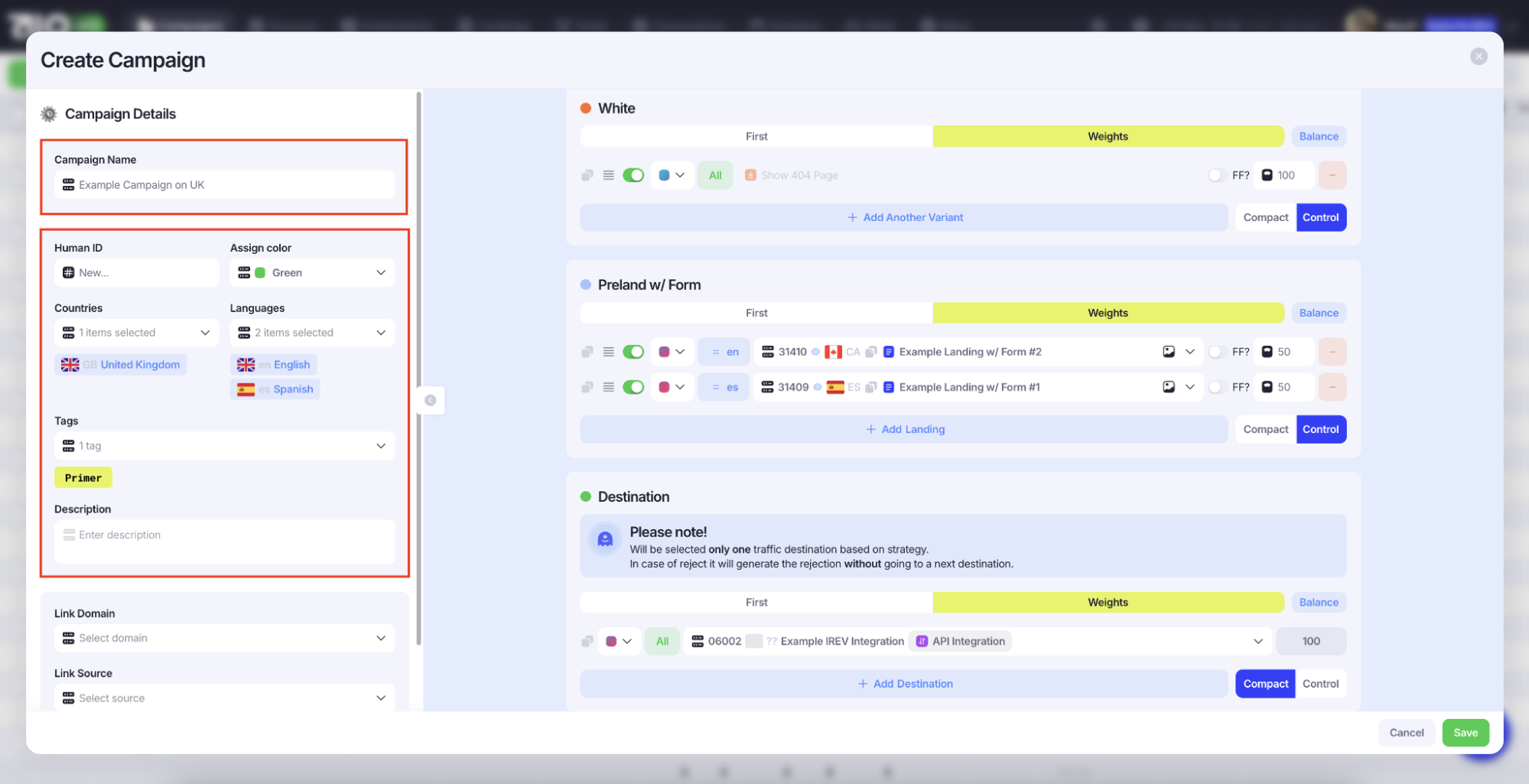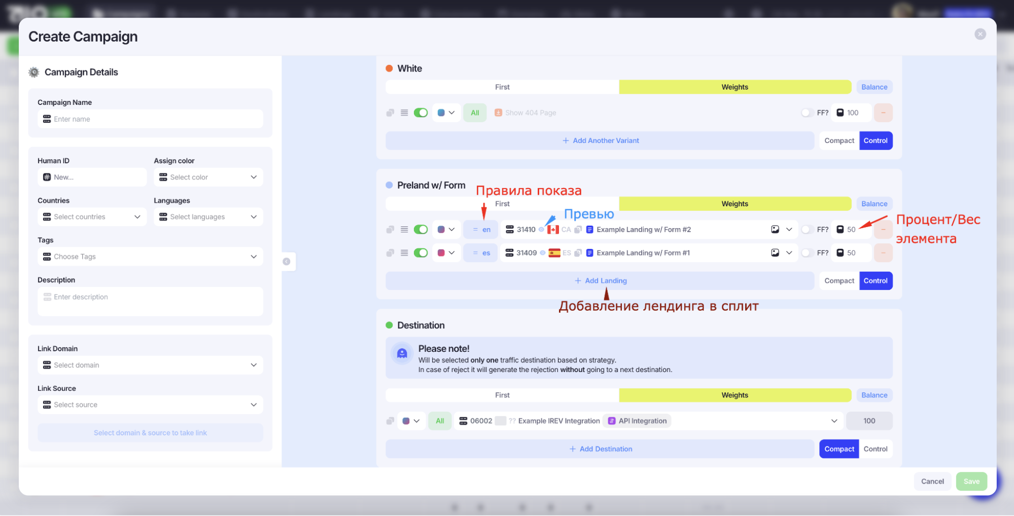 Настройка «Destination» работает аналогично: выберите оффер, добавьте правила и распределение по весам. Чтобы включить или выключить любой элемент, переключитесь из «Compact Mode» в «Control».