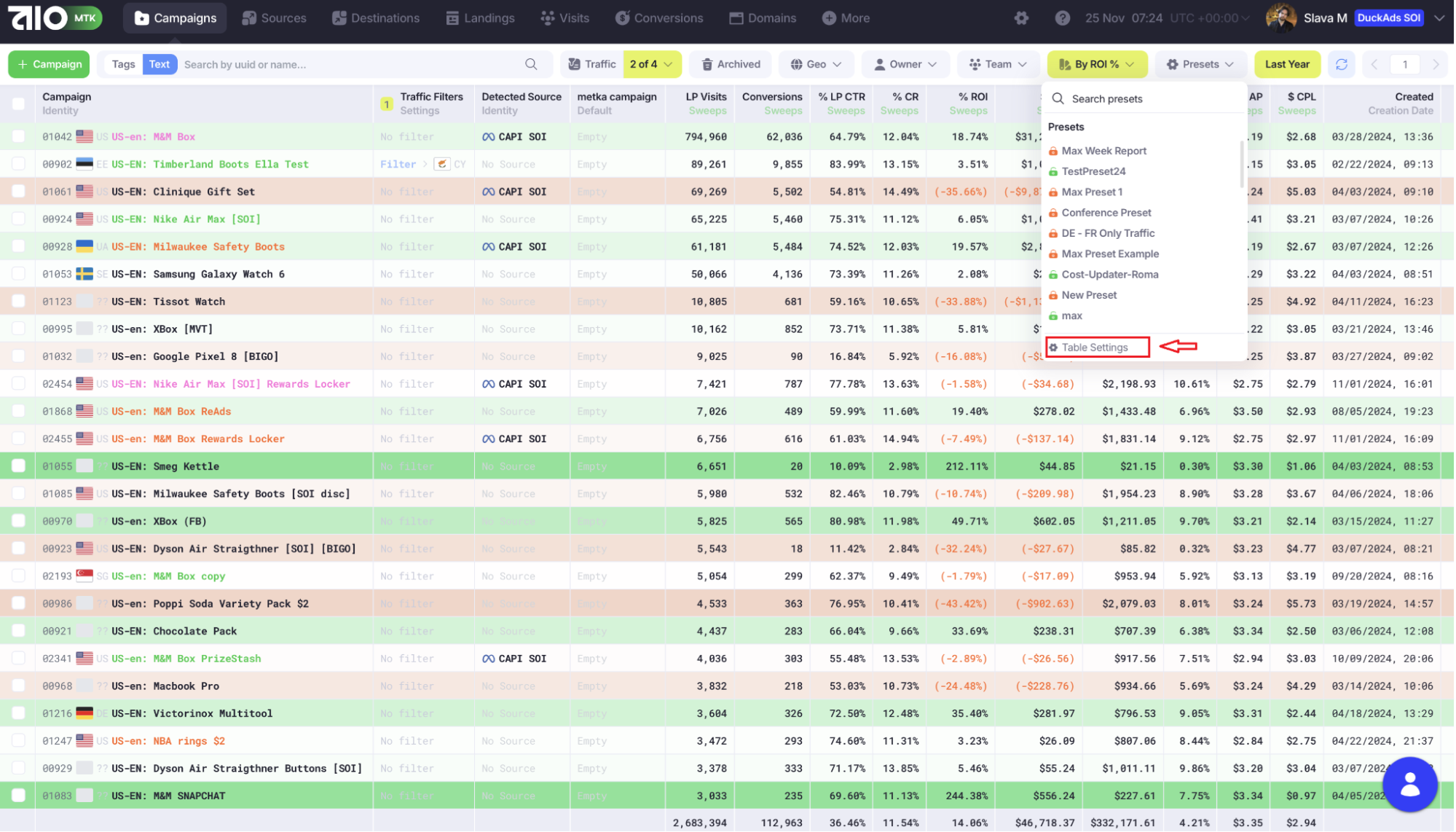 1. В разделе «Campaigns» откройте вкладку «Presets», а затем нажмите «Table Settings».