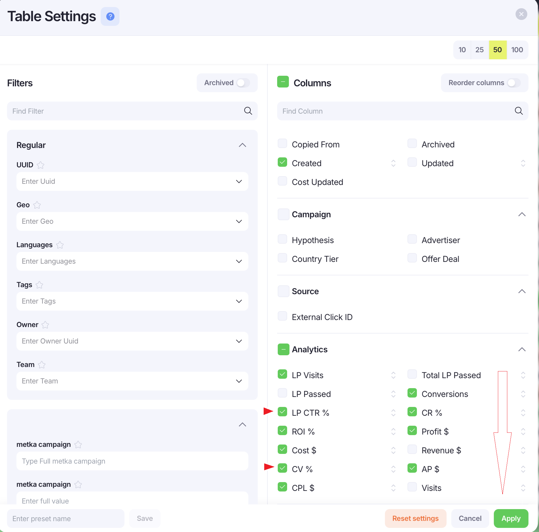 2. В открывшемся окне уберите ненужные метрики и нажмите «Apply». Всегда можно сохранить любой пресет, чтобы быстро фильтровать трафик