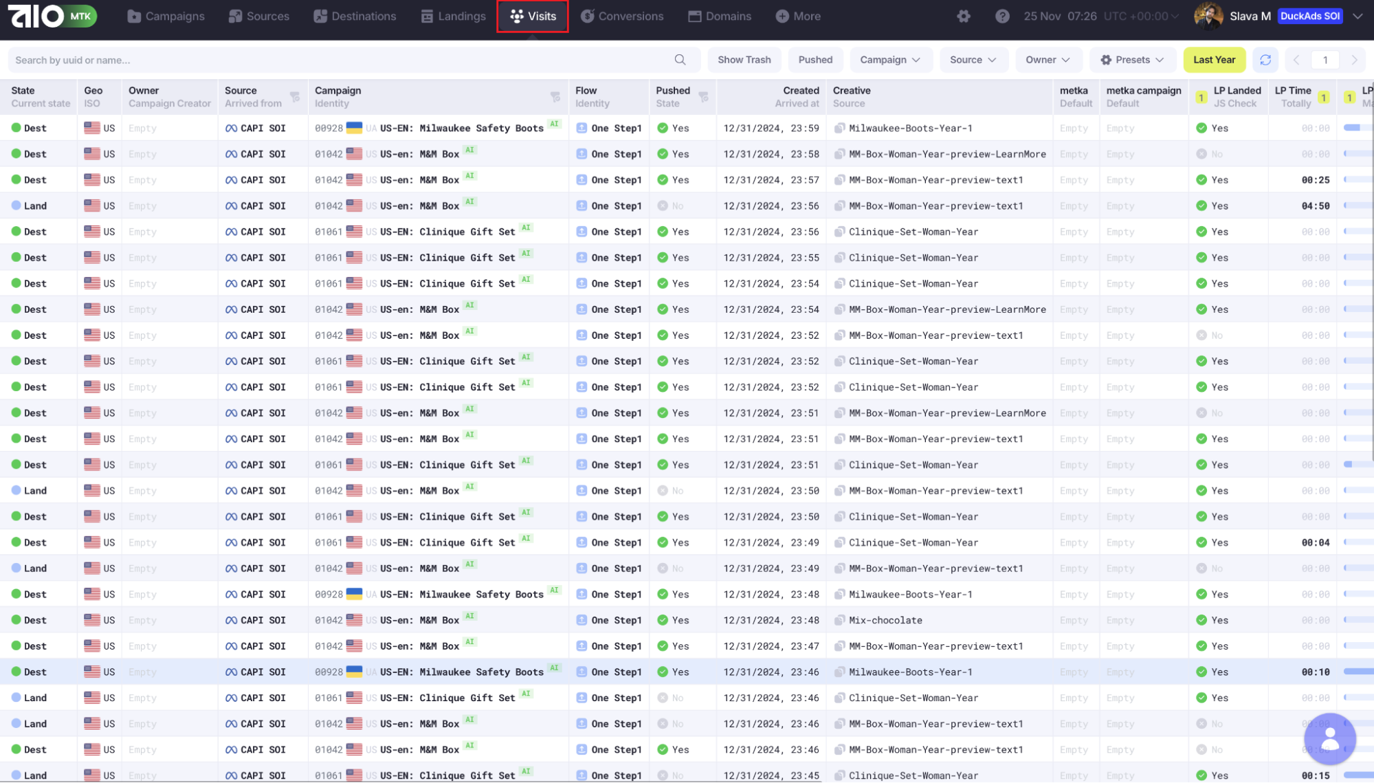 Во вкладке «Visits» можно увидеть все клики: источник, user-agent, реферальную ссылку и креативы.