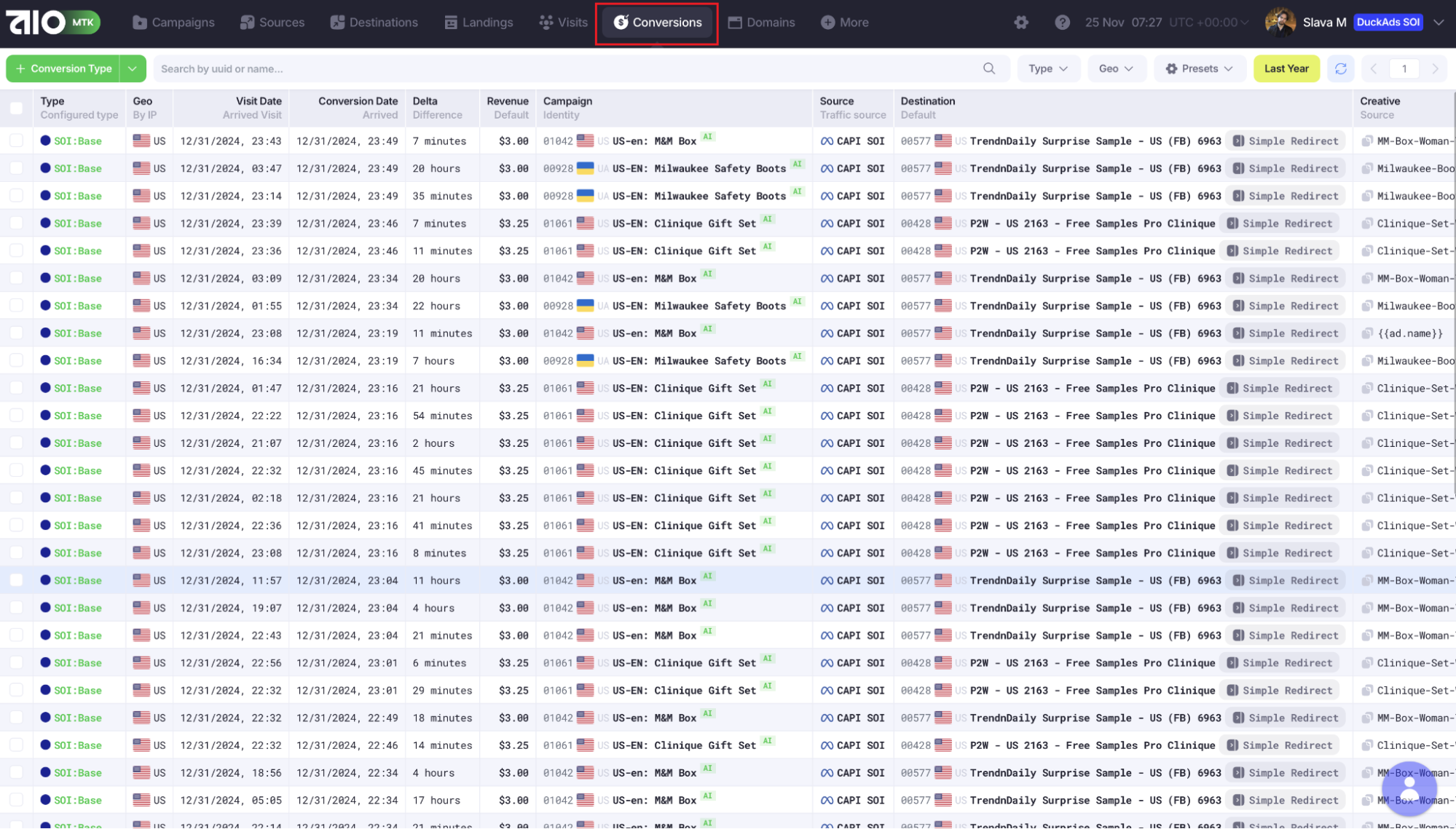Во вкладке «Conversions» находятся клики с определенным целевым действием. Метрики также можно фильтровать по разным параметрам.