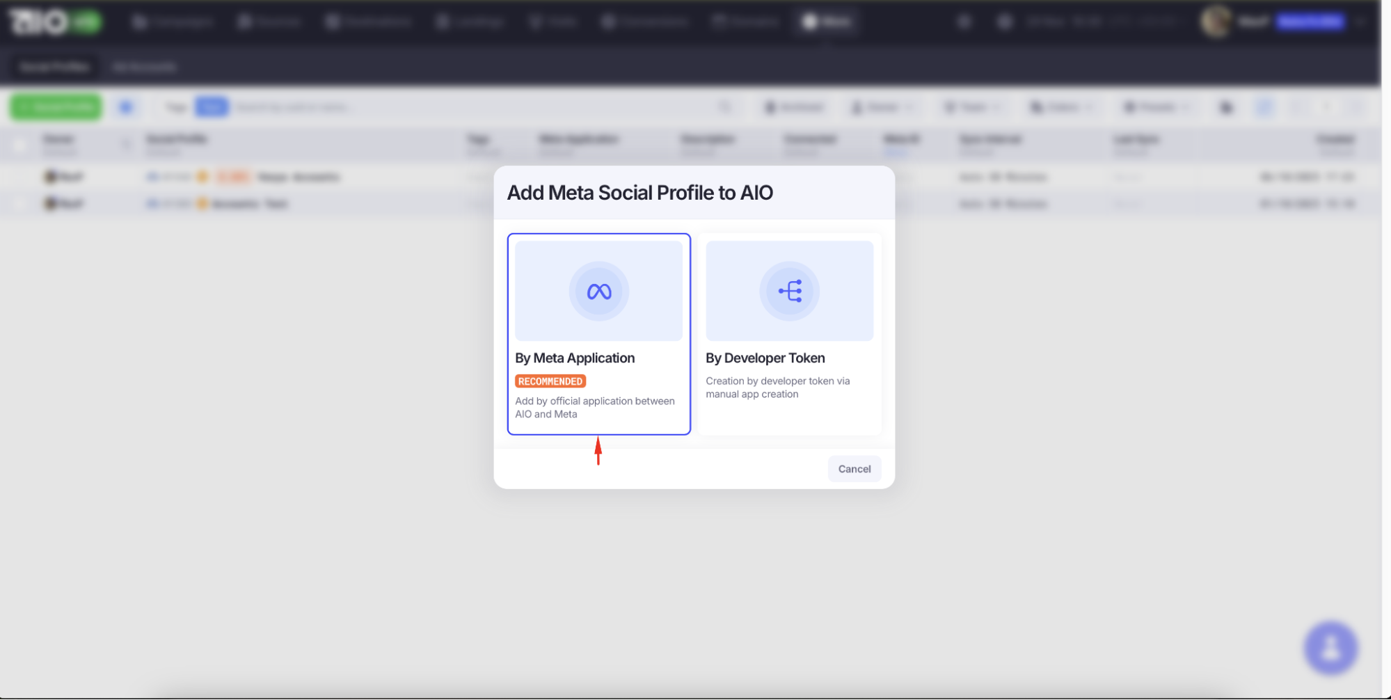 1. Откройте раздел «Meta*», перейдите на вкладку «Social Profiles». 2. Через «+» выберите «By Meta* Application» и задайте название аккаунта.