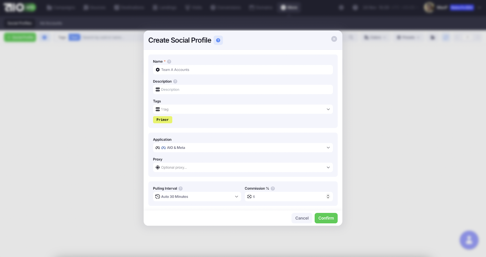 3. Выберите приложение «AIO & Meta*», поставьте пуллинг-интервал в 30 минут и выставьте комиссию, с которой вы работаете по агентским аккаунтам. Проксировать необязательно.