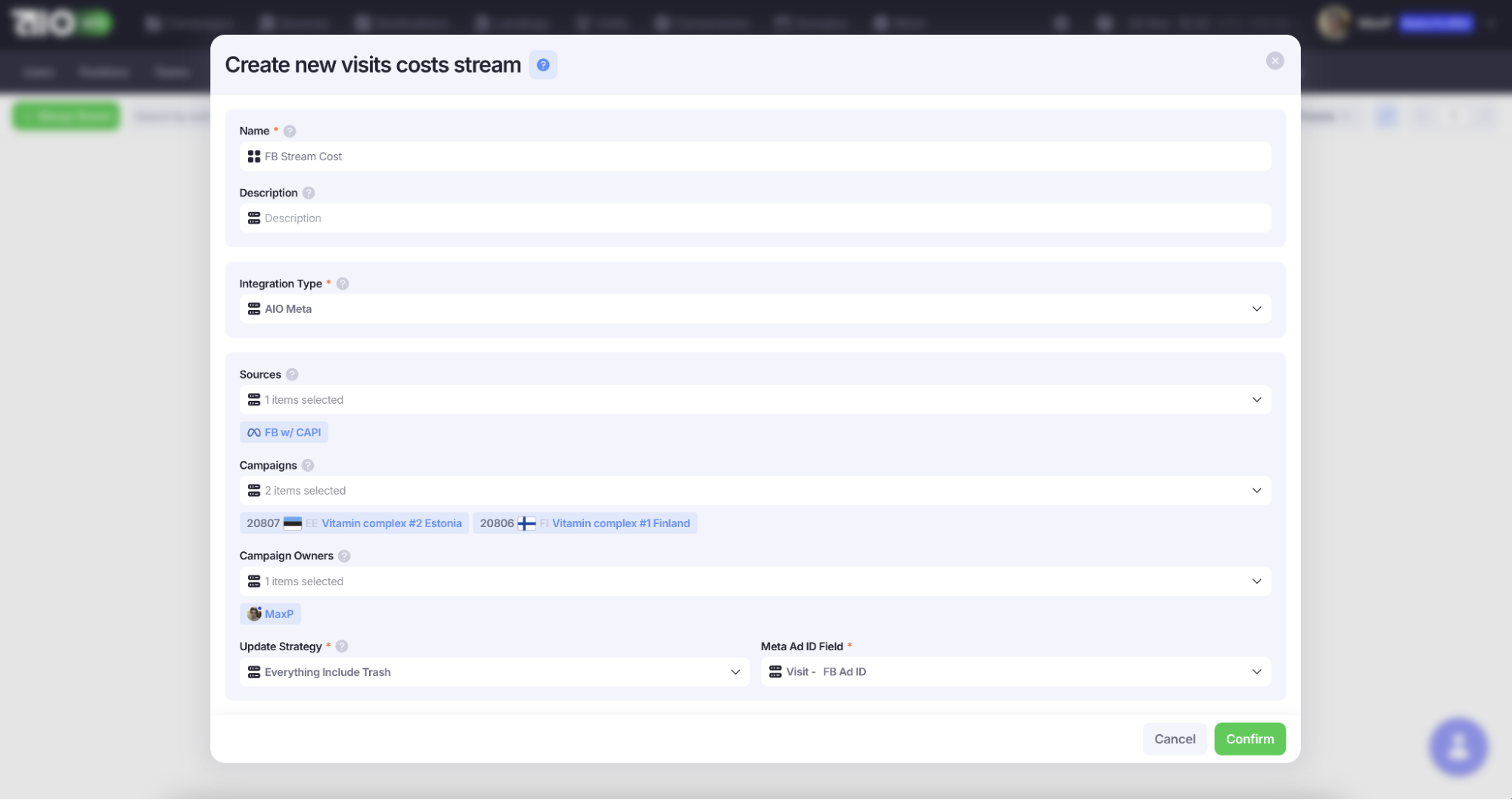 2. Выберите источник Facebook*, кампанию, овнера и Ad ID.