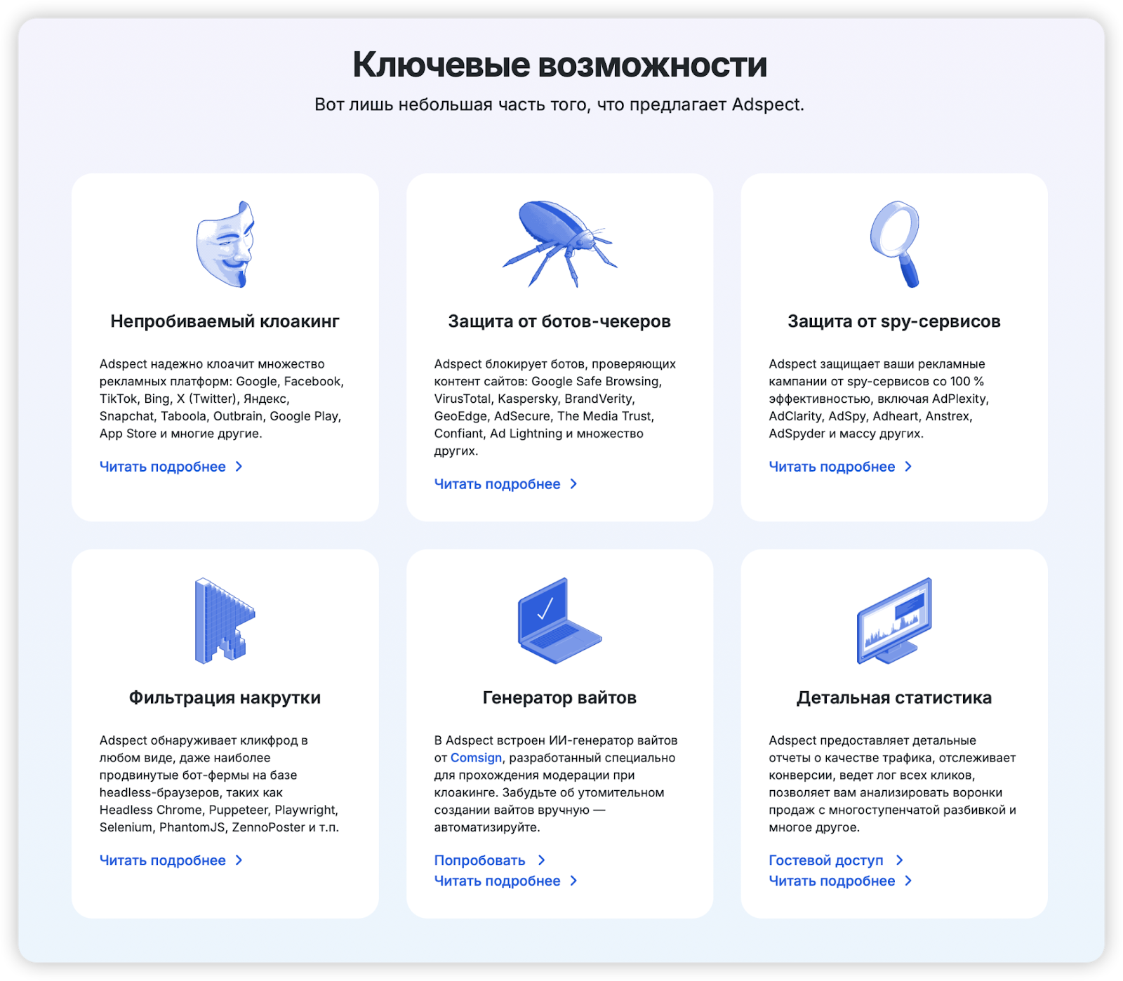 Ниже — 8 ключевых возможностей Adspect.ai.