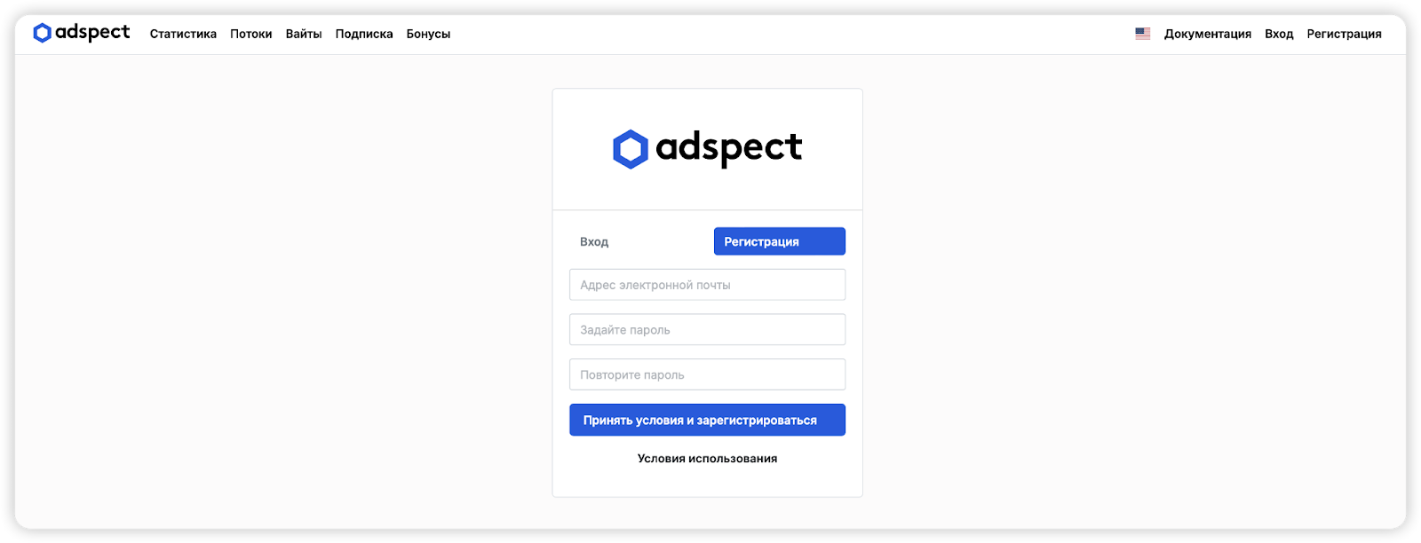 Перейдите на сайт Adspect.ai и зарегистрируйтесь, указав email и пароль.