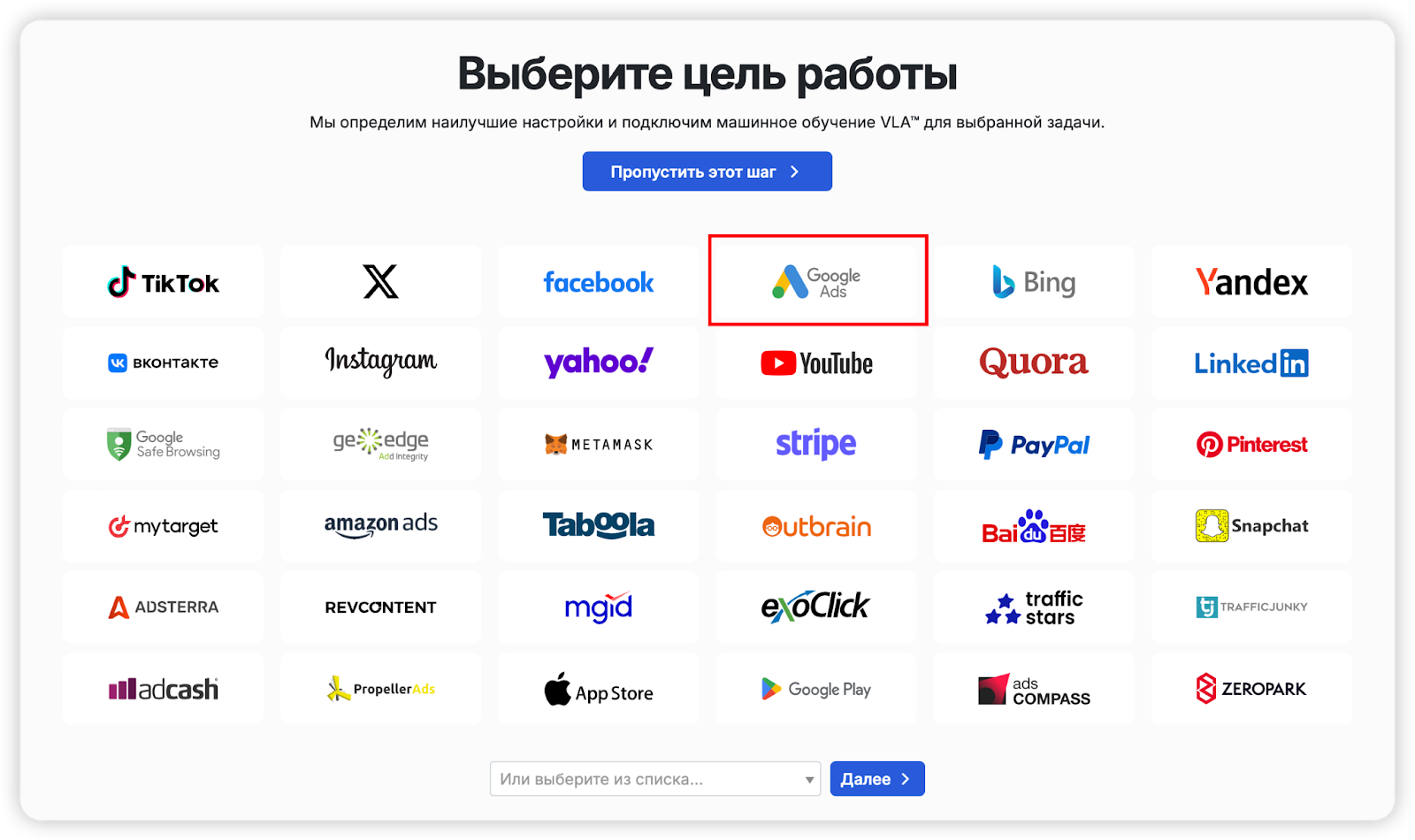 2. Выберите источник трафика, например Google Ads.