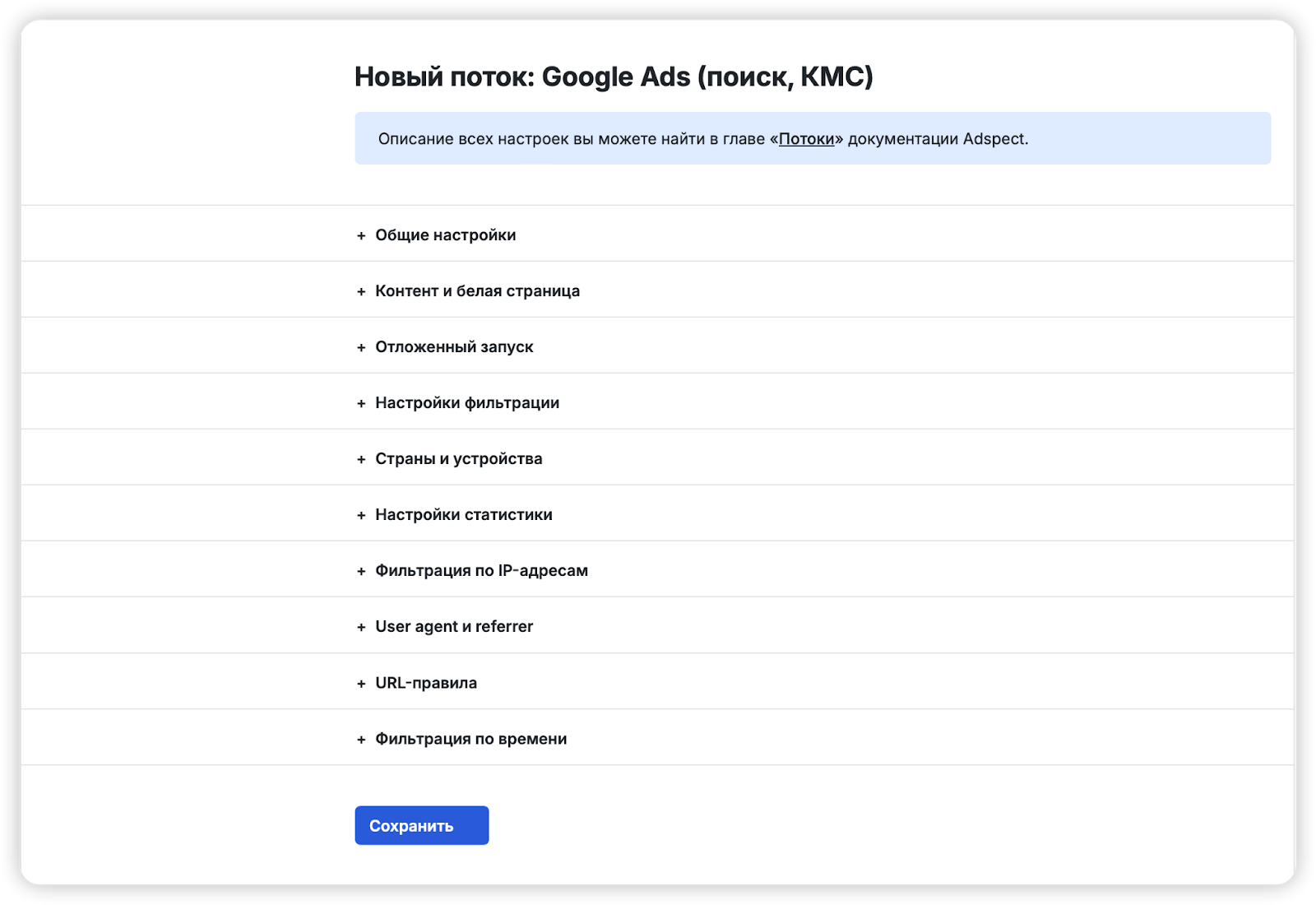 Далее нажмите «Сохранить». Новый поток появится во вкладке «Потоки».