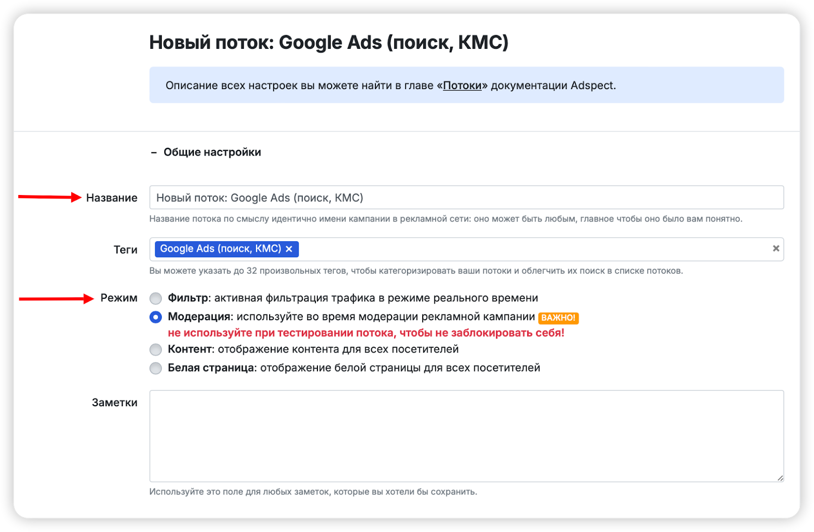 3. В разделе «Общие настройки» задайте название потока и выберите режим.