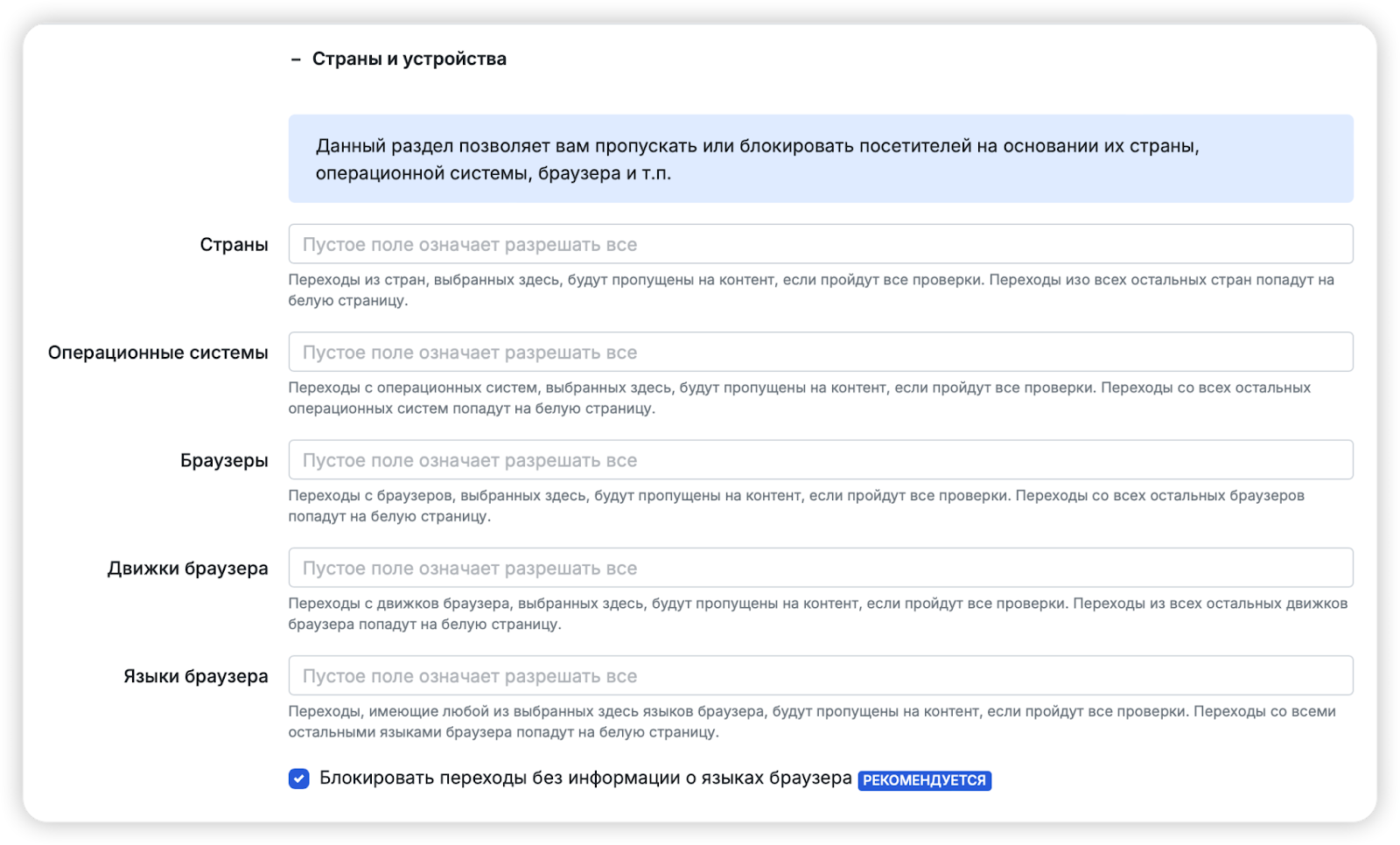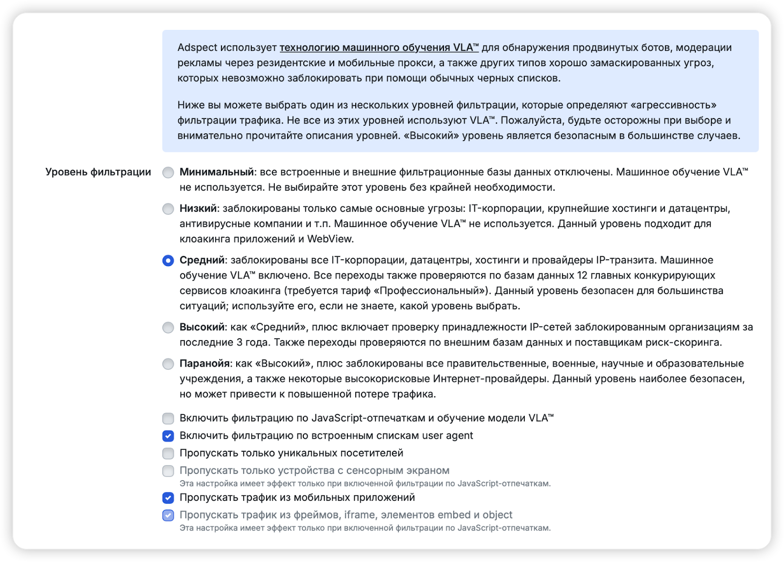 Выбор уровня фильтрации зависит от сложности вашего источника трафика. Чтобы пройти модерацию в Google Ads и Facebook*, рекомендуется выбирать уровень «Высокий». Эти рекламные платформы часто проводят повторные проверки ссылок, чтобы выявить запрещенные офферы.