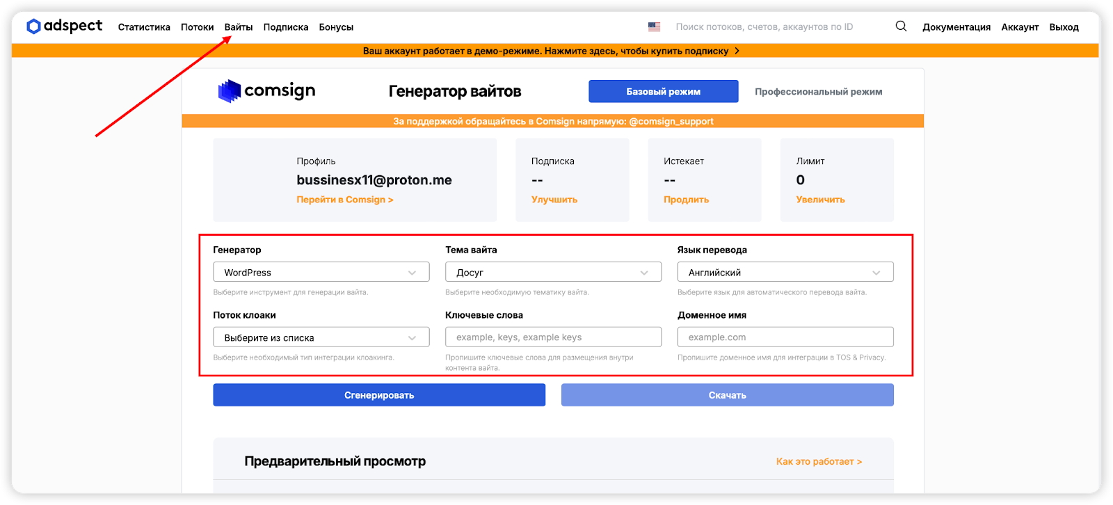 У Adspect.ai нет бесплатного тарифа, но есть демо-версия, которая позволяет познакомиться с функционалом платформы, в том числе с генератором вайтов.
