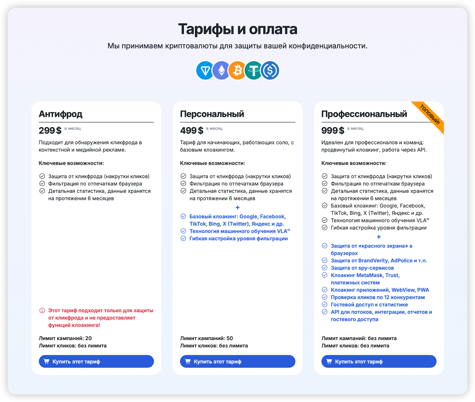 Важно: в этом тарифе нет функции клоакинга.