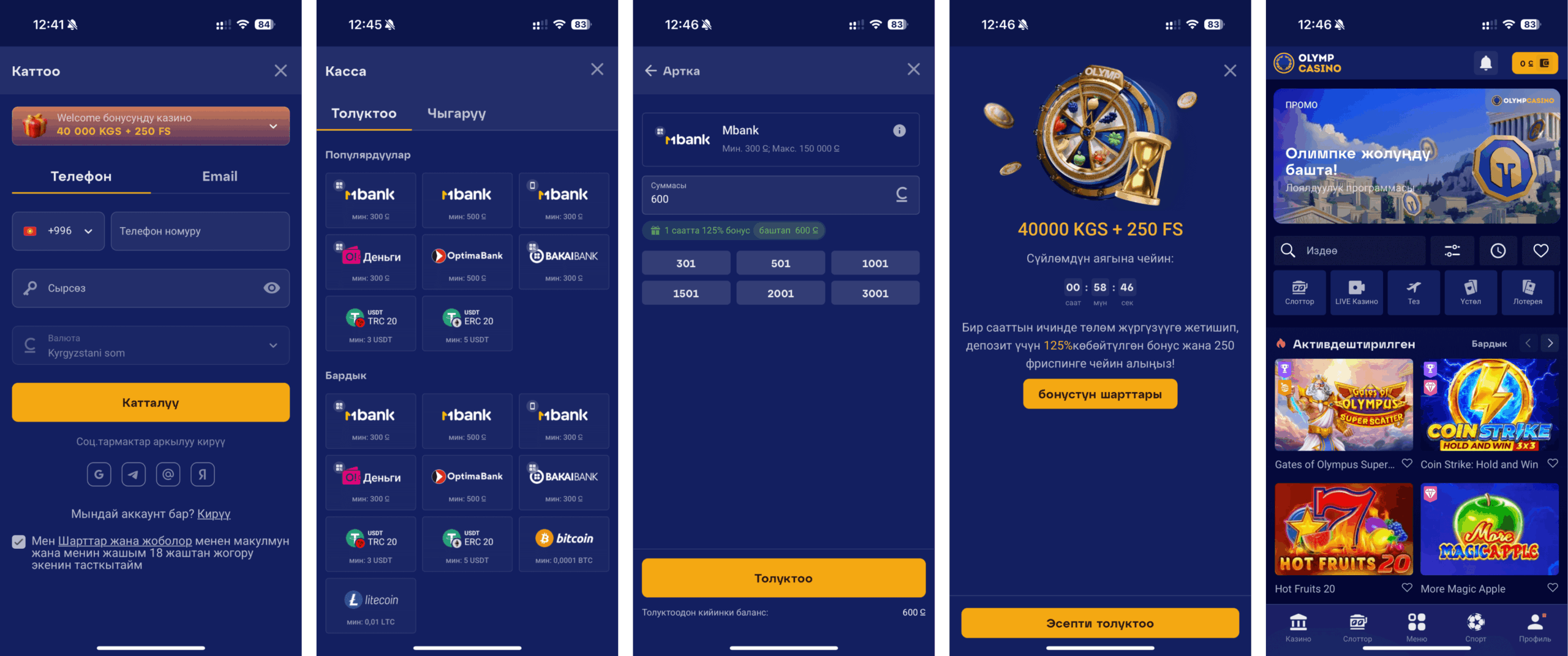 Пользователь регистрируется, выбирает метод пополнения, вносит депозит, получает бонус 40000 KGS + 250 FS и выбирает игру. Понятный и простой флоу.