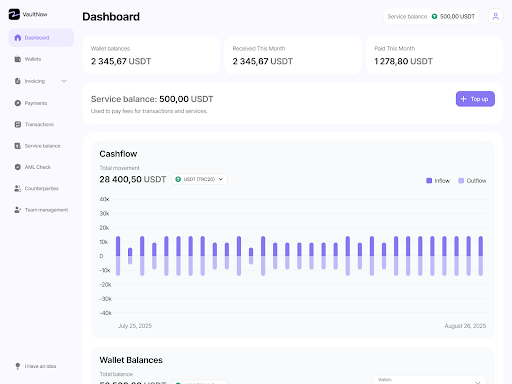 VaultNow — не кошелек и не биржа. Это единая система управления крипто-финансами для бизнеса: учет, выплаты, аналитика и контроль в одном месте.