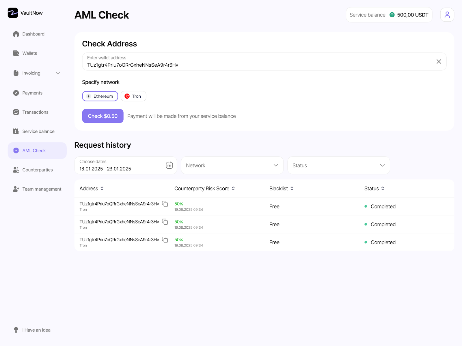 Новый контрагент — всегда риск. Деньги ушли, а потом выясняется, что кошелек засвечен или участвует в «серых» схемах. Чтобы знать, с какого кошелька приходит платеж или куда он отправляется, достаточно заглянуть на вкладку AML-check.