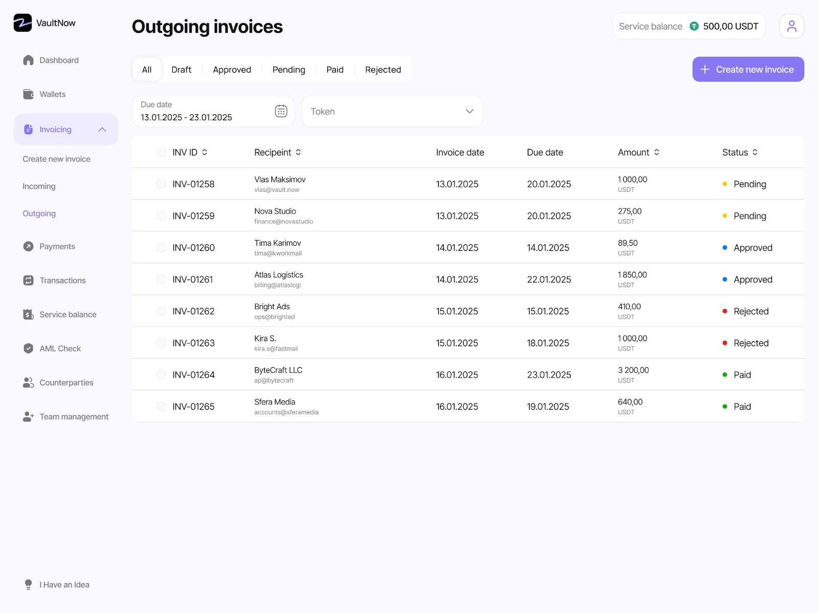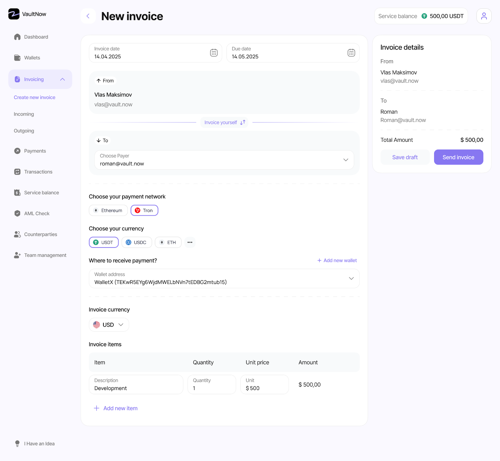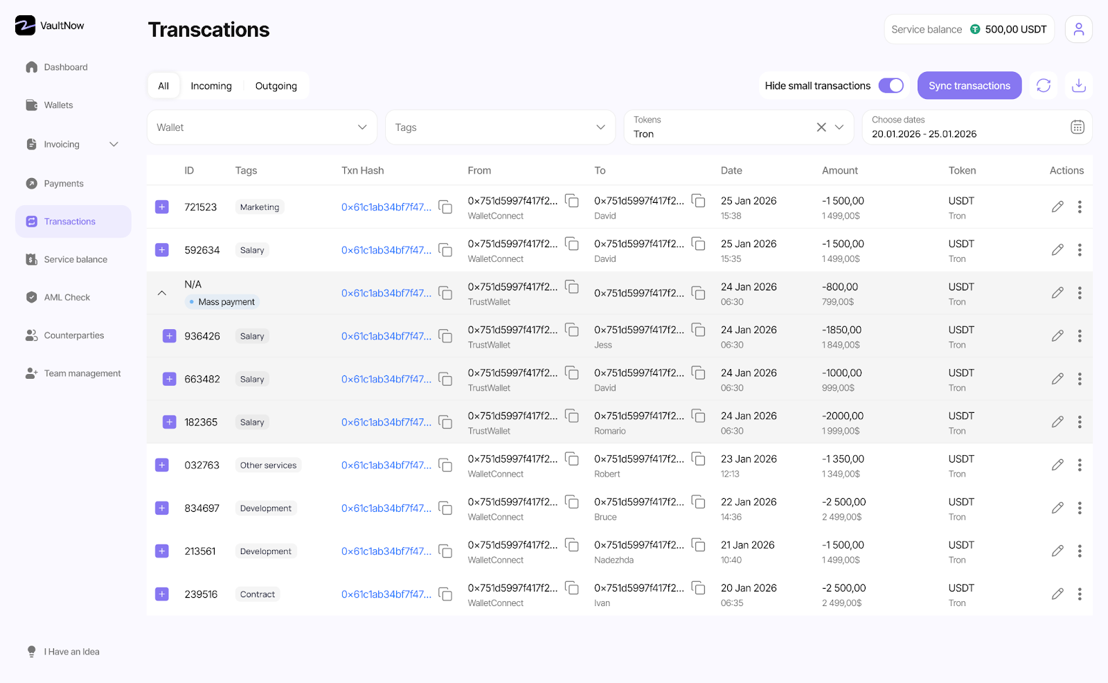 Можно выставлять инвойсы своим клиентам и контролировать поступления средств. VaultNow позволяет проводить весь цикл инвойсинга в одном кабинете. Это значительно ускоряет работу при больших объемах платежей: все оплаты, статистику по тегам видно в одном дашборде.