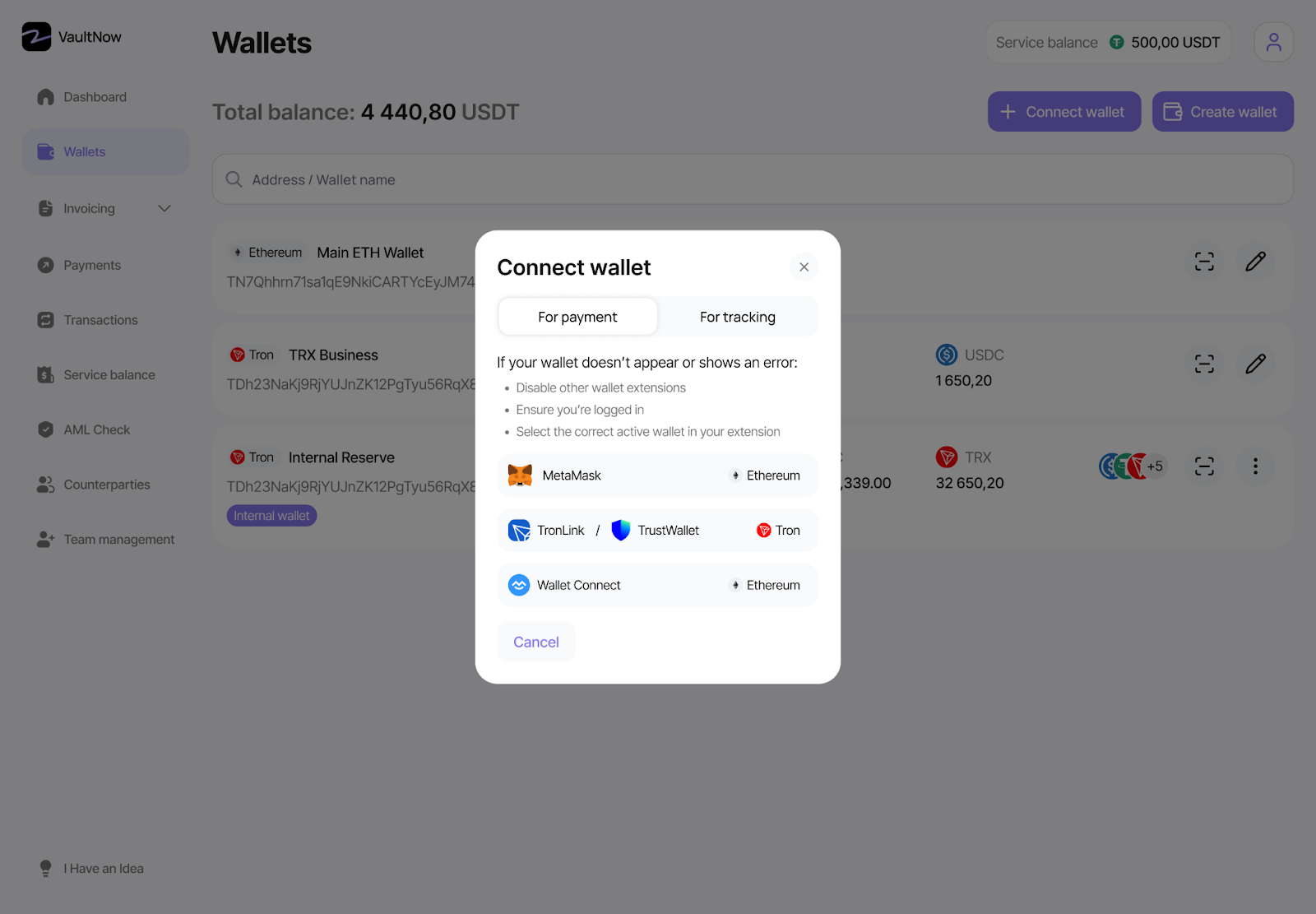 2. Подключить кошельки. Можно создать внутренний кастодиальный кошелек на TRX или ETH для выплат, инвойсов и входящих средств. Или привязать существующие кошельки — тогда все транзакции начнут собираться в одном месте с разметкой и аналитикой.